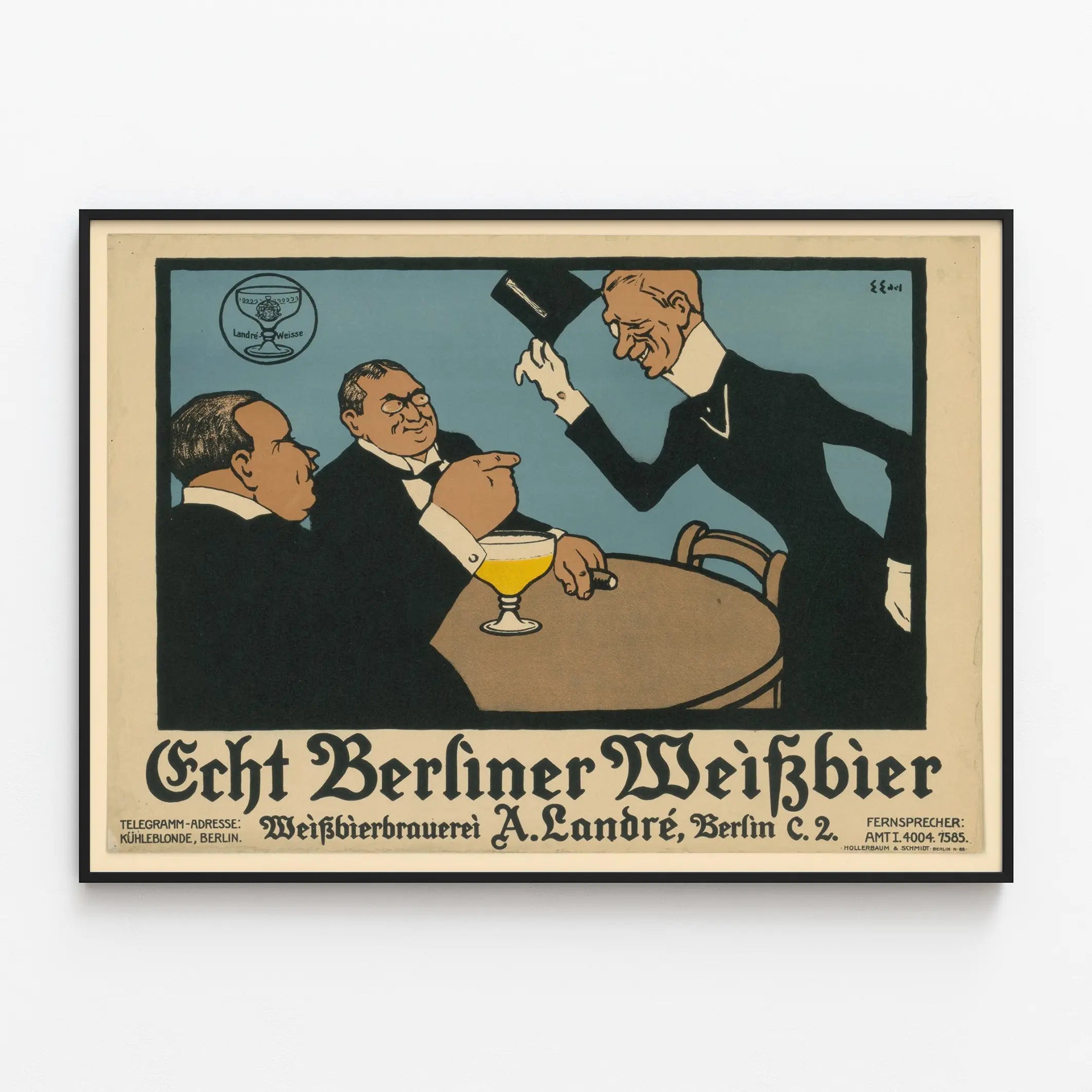 Cette affiche vintage publicitaire met en scène une scène conviviale autour d'un verre de bière blanche, illustrant l'Echt Berliner Weißbier de la brasserie Weißbierbrauerei A. Landré à Berlin. Le style graphique et le choix des couleurs rappellent avec authenticité les affiches publicitaires classiques, évoquant l'ambiance des établissements de dégustation de l'époque. Ce poster est idéal pour une décoration murale originale, apportant une touche rétro et culturelle à votre intérieur. L'image montre deux hommes assis, en tenue élégante, échangeant avec un serveur lui aussi habillé formellement, suggérant une atmosphère sophistiquée et détendue. Le verre de bière jaune vif et mousseux sur la table attire naturellement le regard, soulignant le produit phare de la brasserie. Le texte en allemand en bas de l'affiche indique clairement la promotion du produit, ajoutant une dimension historique et typographique intéressante à ce tableau décoratif. Parfait pour une ambiance vintage dans un bar, une cuisine ou une salle de séjour, ce poster d'affiche publicitaire est une pièce de décoration murale unique qui saura séduire les amateurs de bière et de design graphique ancien. Offrez à vos murs une touche d'histoire liée à l'univers de la brasserie berlinoise avec cette affiche élégante et pleine de caractère.