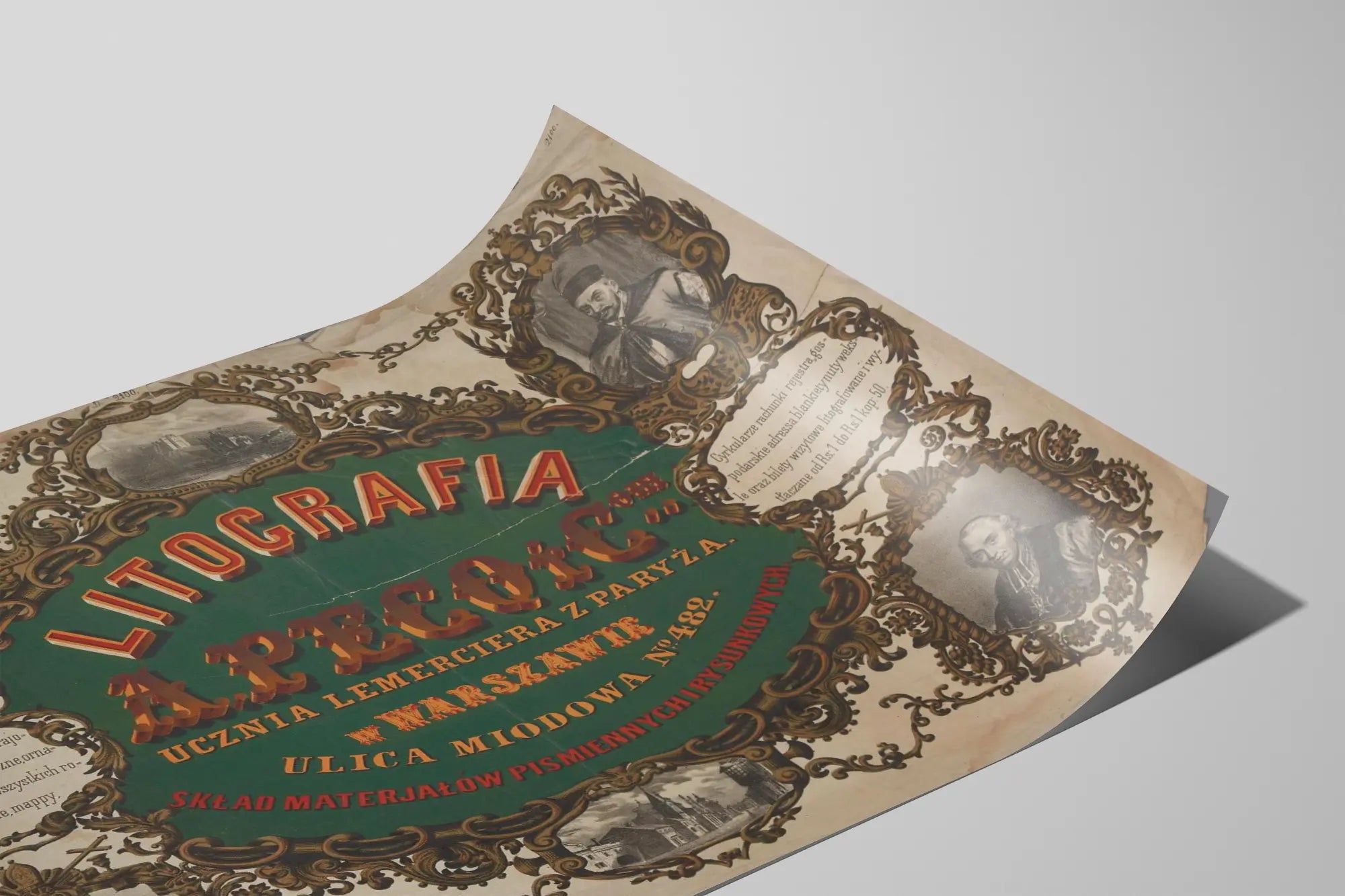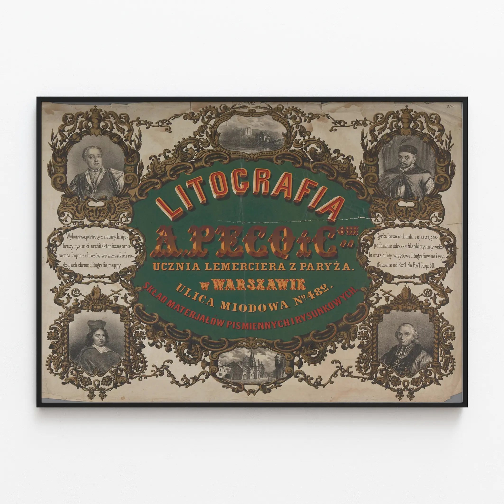 Cette affiche vintage de style lithographique publicitaire met en avant l'atelier "Litografia A. Pecq & Co." situé à Varsovie, rue Miodowa n°482. Ce poster ancien se distingue par ses éléments décoratifs richement travaillés, avec des encadrements ornementaux dorés autour de portraits et d'illustrations architecturales. Le texte central coloré sur fond vert attire le regard sur le nom de l'atelier, spécialisé dans la lithographie, un procédé d'impression historique apprécié pour la reproduction d'images et d'affiches détaillées.