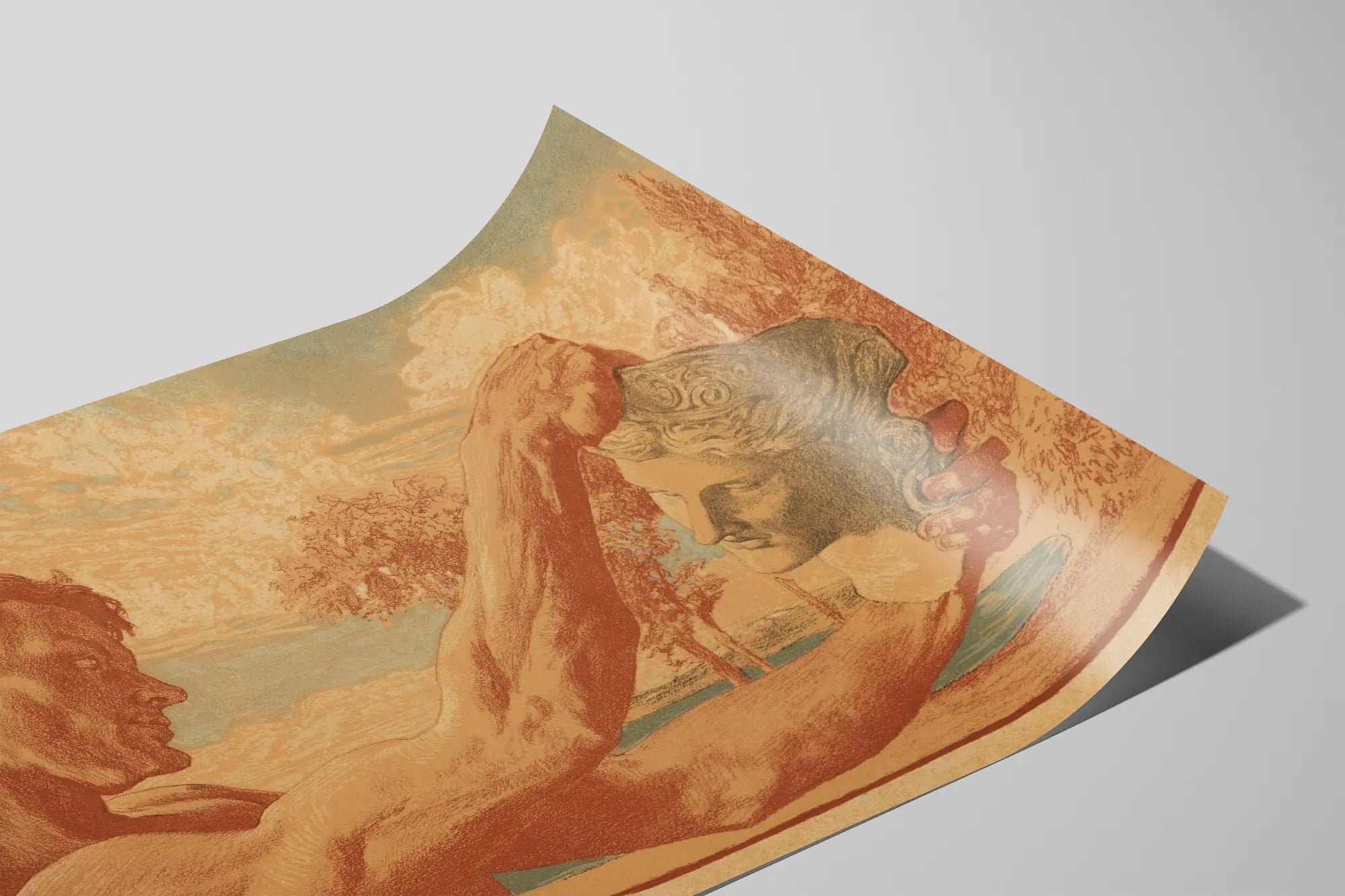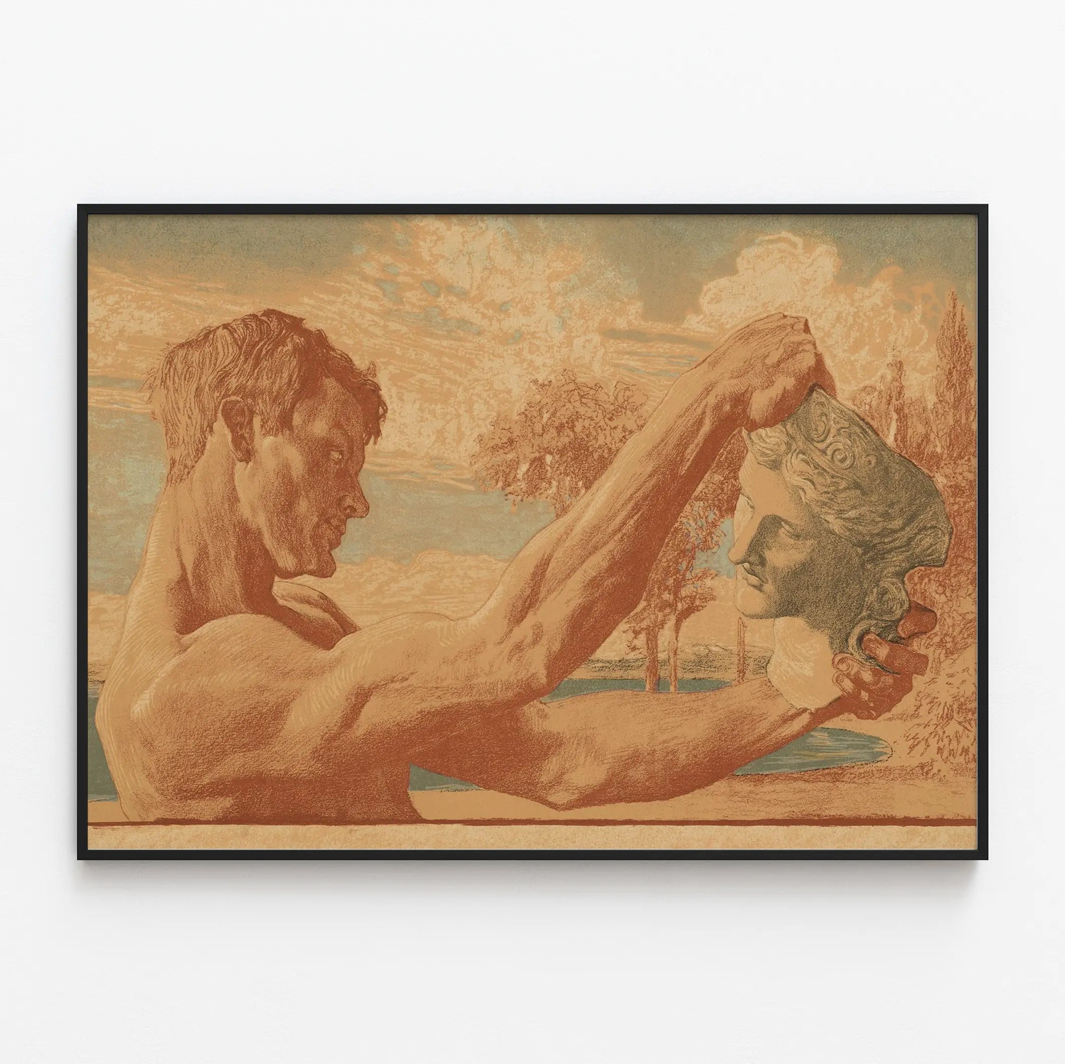 Cette affiche vintage met en scène une illustration classique représentant un homme musclé tenant un buste sculpté de style antique. La composition artistique évoque un profond hommage à l'art sculptural classique, où la force humaine et la finesse du portrait en marbre rivalisent pour attirer le regard. Les teintes chaudes, dominées par des nuances de brun, beige et touches subtiles de bleu, insufflent à cette décoration murale une atmosphère à la fois nostalgique et intemporelle. Le style graphique rappelle les gravures ou lithographies anciennes, renforçant le charme authentique de cette affiche qui s'intègre parfaitement dans un intérieur au style classique ou vintage. Ce poster artistique s'adresse aux passionnés d'histoire de l'art, de sculpture ou de design classique, cherchant à embellir leurs murs avec une touche de culture et d'élégance. Qu'il soit encadré ou fixé tel quel, ce motif mural valorise tout espace en y apportant une note de raffinement et de contemplation artistique. Cette décoration murale invite à la réflexion sur l'harmonie entre la forme humaine et l'œuvre sculptée, symbolisant la transmission culturelle à travers les âges. Un choix parfait pour une ambiance studieuse, un salon ou un bureau d'inspiration classique, valorisant la beauté des formes et la richesse du patrimoine artistique.