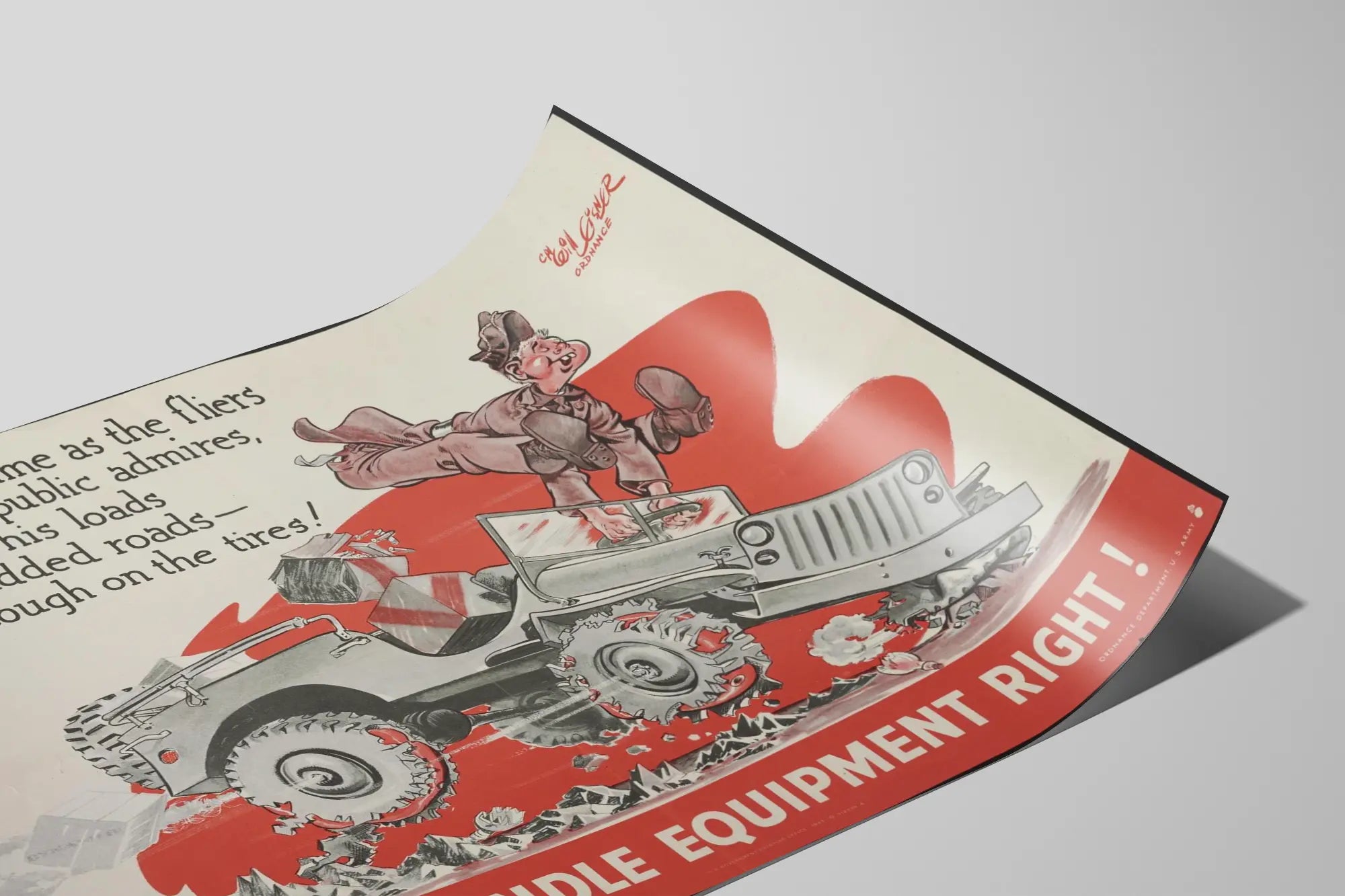 Cette affiche vintage de décoration murale met en avant un message poignant sur la prudence dans la manipulation du matériel. Illustrée dans un style rétro et humoristique, elle présente un personnage nommé Joe Dope en pleine chute d'une jeep militaire aux pneus déchirés. Cette image originale, mêlant dessin caricatural et texte manuscrit, attire l'attention sur l'importance de manier correctement les équipements pour éviter les accidents et les dommages. L'affiche joue avec une palette de couleurs principalement en rouge, gris et noir, qui renforcent le contraste et la lisibilité du message. Son texte rimé ajoute une dimension poétique et mémorable, encourageant à ne pas être maladroit (« Don't be a dope! Handle equipment right! »), un avertissement intemporel qui trouve une place de choix dans les environnements industriels, d'entrepôt ou dans un intérieur à thème militaire ou vintage. Cette pièce de décoration murale peut aussi séduire les amateurs d'art graphique militaire et d'affiches historiques, apportant une touche originale et éducative au mur. Parfaite en format poster ou encadrée en tableau, cette affiche vintage s'intègre à diverses ambiances grâce à son design à la fois graphique et narratif. Un choix idéal pour ceux qui cherchent à combiner art, histoire et message pratique dans leur décoration intérieure.