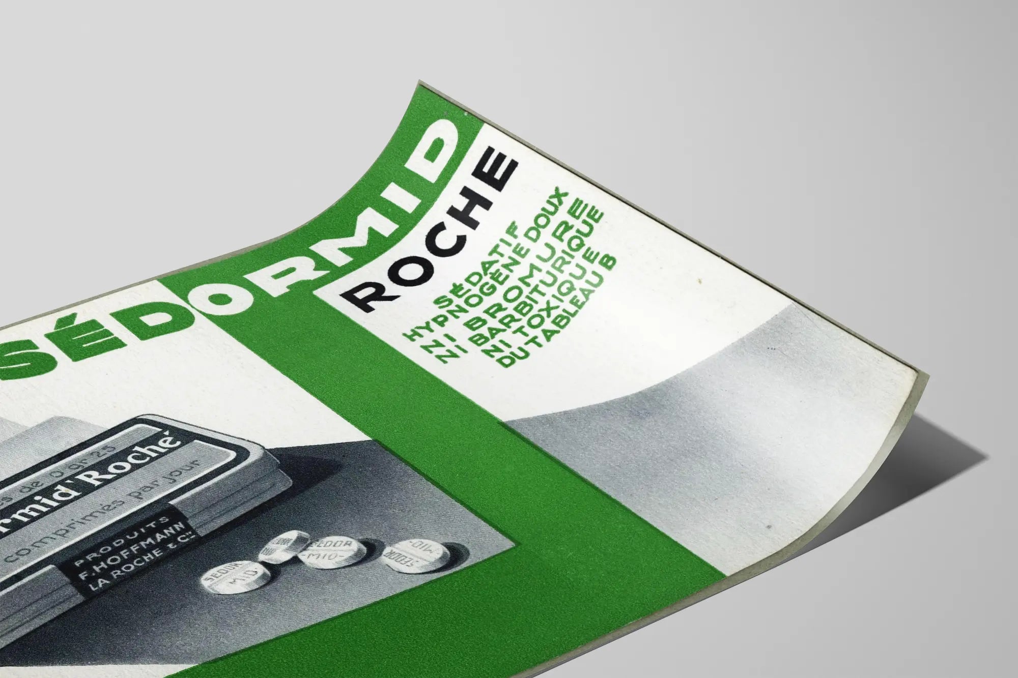 Cette affiche vintage représente une publicité pour le médicament Sédormid Roche, avec un design graphique typique du milieu du XXe siècle. Le visuel met en avant une boîte de comprimés ainsi que quatre cachets dispersés en avant-plan. Le cadre coloré en vert et blanc apporte une esthétique rétro, caractéristique des affiches publicitaires de cette époque. Le texte en majuscules annonce les caractéristiques du médicament, soulignant qu'il s'agit d'un sédatif hypnogène doux, sans bromure, sans barbiturique et non toxique selon le tableau B.