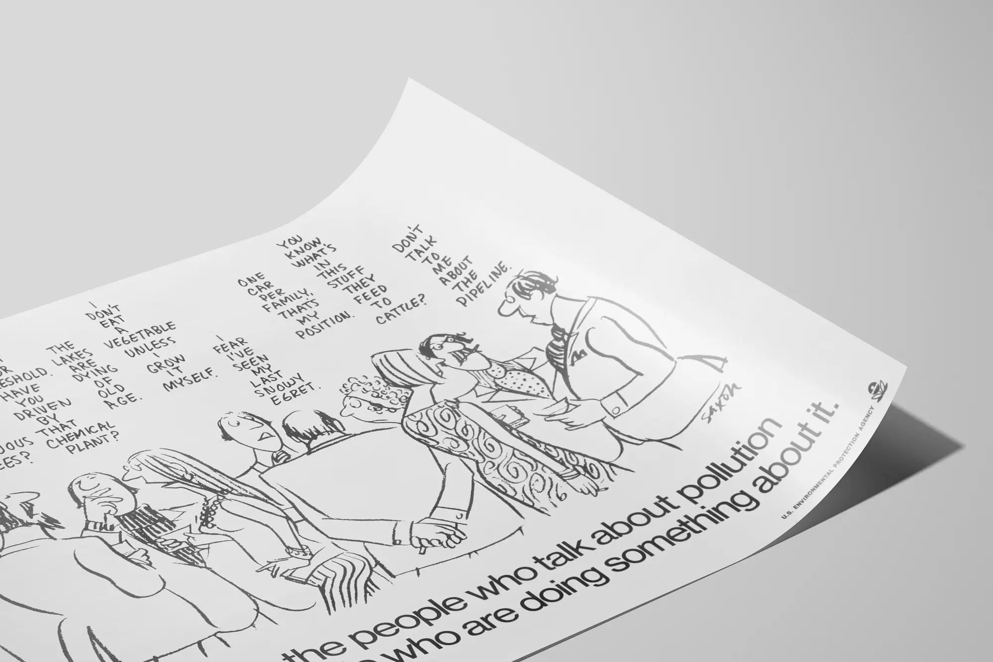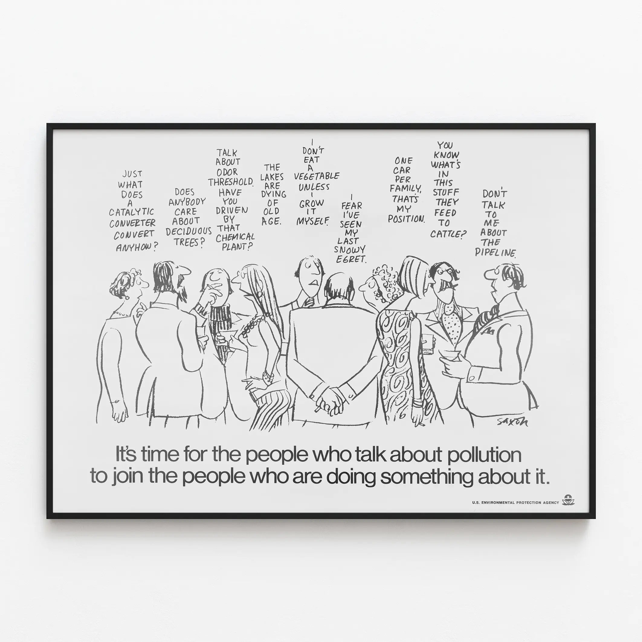 Cette affiche vintage de sensibilisation à la pollution issue de l'U.S. Environmental Protection Agency est un excellent choix de décoration murale pour ceux qui souhaitent allier engagement environnemental et style rétro. Le design en noir et blanc présente un groupe de personnages dessinés en style bande dessinée, débattant et s'interrogeant sur différents aspects de la pollution et de l'environnement, comme les convertisseurs catalytiques, les arbres à feuilles caduques, les usines chimiques, la qualité de l'air et de l'eau, ou encore les pratiques agricoles. Ce poster incite à passer de la parole à l'action avec un message clair et engagé inscrit en bas : "It's time for the people who talk about pollution to join the people who are doing something about it.", soulignant l'urgence d'agir concrètement contre la pollution. Cette décoration murale est idéale pour un bureau, une salle de réunion ou un espace dédié à la sensibilisation environnementale. Elle apporte une touche à la fois éducative et esthétique grâce à son dessin simple et expressif tout en transmettant un message fort sur l'importance de la responsabilité collective. Ce tableau mural en papier, avec son graphisme épuré et son contenu engagé, répond parfaitement aux besoins des amateurs de posters thématiques et des défenseurs de la nature souhaitant décorer leurs murs avec des images porteuses de sens.