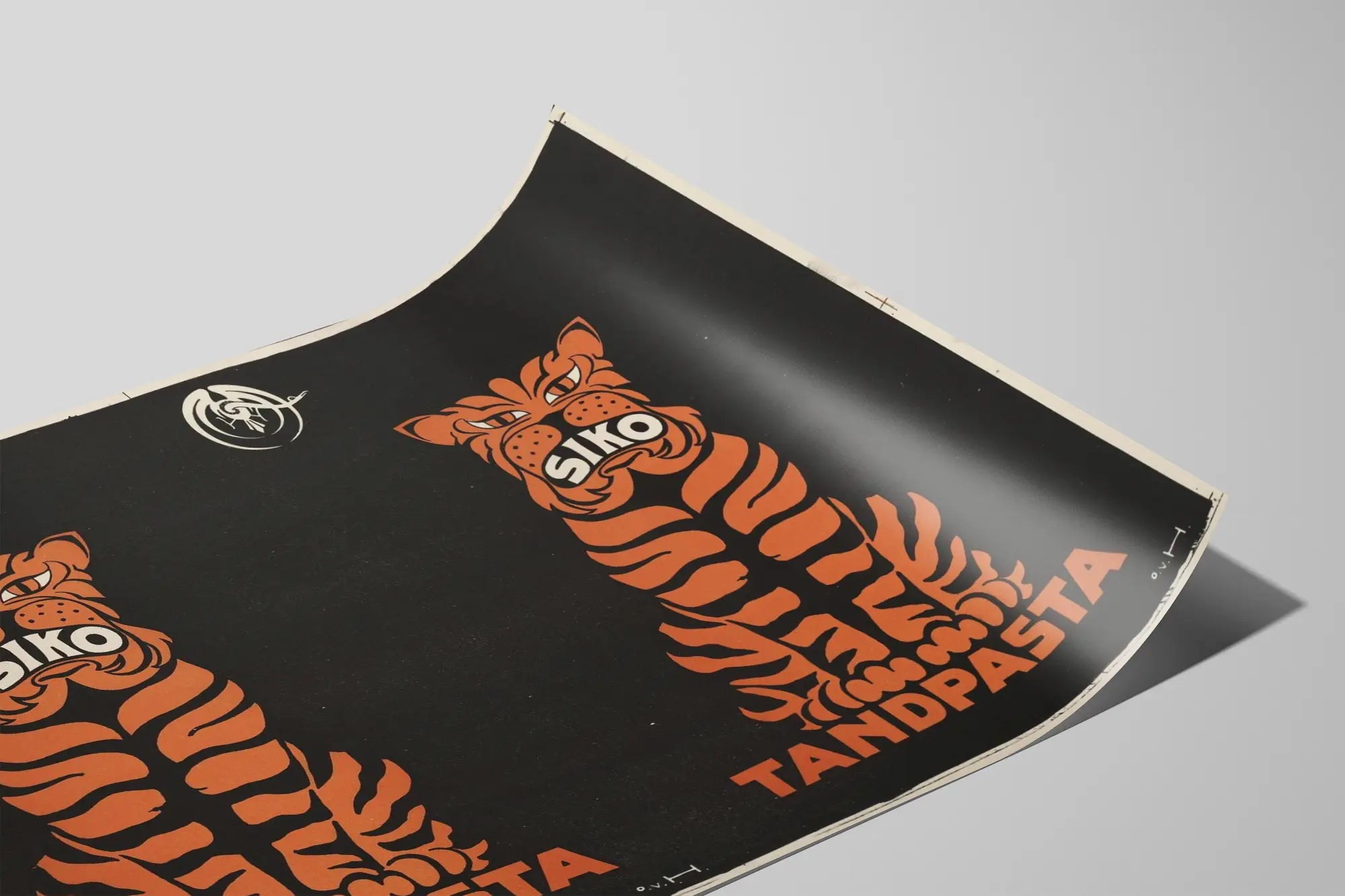 Cette affiche vintage représente une illustration en double d'un tigre stylisé en orange sur un fond noir intense, avec le mot "SIKO" inscrit dans la bouche de l'animal et "TANDPASTA" écrit en lettres majuscules sous chaque tigre. Ce poster publicitaire met en avant de manière graphique et saisissante le produit "Siko Tandpasta", une pâte dentifrice. Le design épuré et les couleurs contrastées de cette décoration murale en font un objet d'art visuel remarquable pour un intérieur moderne ou rétro. Les lignes anguleuses et le style géométrique du tigre apportent une touche d'originalité et d'authenticité à votre espace. Parfait pour les amateurs d'affiches anciennes et de publicité d'époque, ce poster souligne le lien entre force et protection dentaire, symbolisé par le tigre. Utilisé comme élément décoratif dans une salle de bain, un bureau ou un salon, ce tableau imprimé apportera une atmosphère unique et vintage à votre mur. Sa composition symétrique en double renforce l'impact visuel et le rend idéal pour une ambiance design ou pop art. En choisissant cette affiche de publicité classique, vous investissez dans une pièce de décoration murale qui allie histoire graphique et esthétique audacieuse, parfaite pour personnaliser vos murs avec caractère et style.