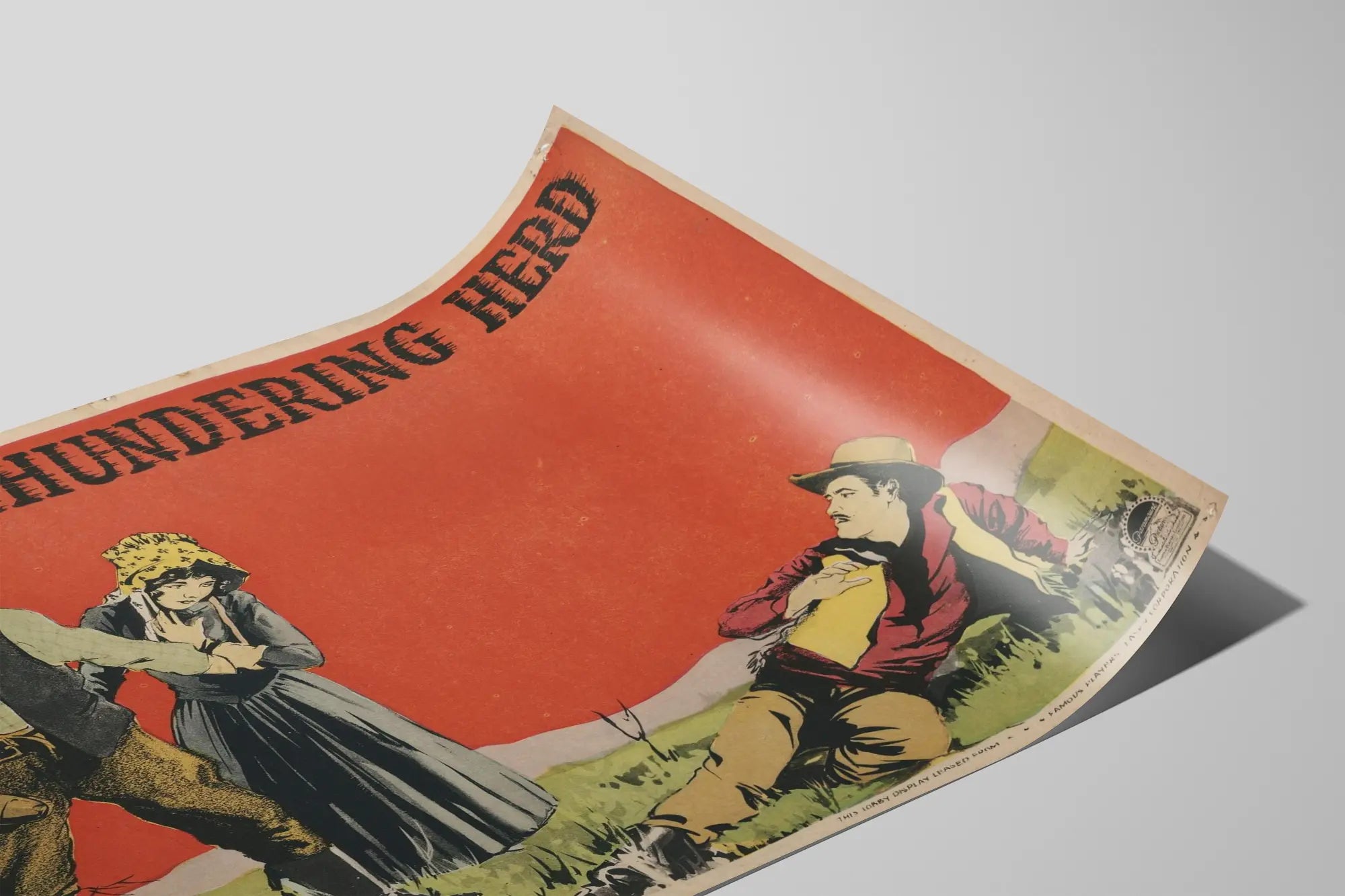 Découvrez cette affiche vintage intitulée "The Thundering Herd", inspirée de l'œuvre de Zane Grey, un classique du western américain. Cette décoration murale évoque une scène typique du Far West, représentant trois personnages dans un paysage ouvert avec un ciel rouge intense en arrière-plan. Le contraste marqué entre les teintes chaudes et les personnages habillés dans des tons sobres crée un effet visuel saisissant. Cette affiche est un poster idéal pour les passionnés de décoration murale à thème western ou vintage, apportant une ambiance dramatique et nostalgique à tout intérieur. Facile à encadrer, elle peut s'intégrer aussi bien dans un salon, un bureau ou une salle de loisirs, ajoutant une touche d'originalité et d'histoire du cinéma classique. Le style graphique et les caractères typographiques en haut de l'affiche renforcent l'aspect rétro et authentique de cette pièce. Parfaite pour les amateurs d'affiches anciennes et de décors inspirants, cette affiche "The Thundering Herd" est un choix élégant pour une décoration murale unique et évocatrice.