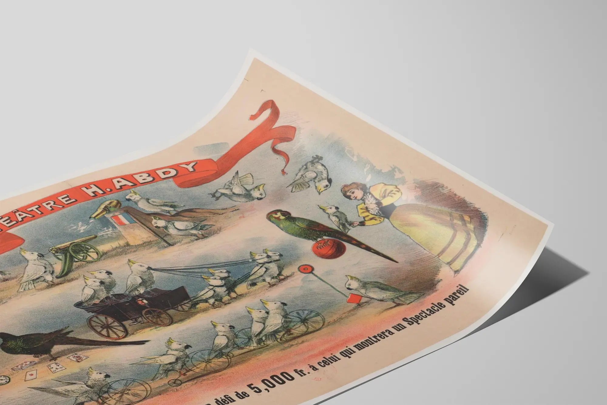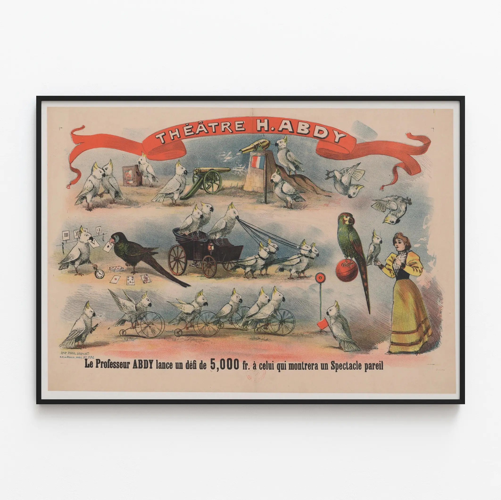 Cette affiche vintage originale du Théâtre H. Abdy illustre de manière charmante un spectacle inédit mettant en scène des perroquets habiles dans diverses performances artistiques. Le dessin met en avant une série de scènes animées où des oiseaux exotiques, principalement des perroquets blancs et colorés, exécutent des tours et manipulent des objets, créant ainsi une ambiance ludique et surprenante. On aperçoit entre autres des perroquets tirant un petit chariot, jouant avec des cartes, faisant rouler une roue, ou encore tenant un drapeau français près d'un canon, soulignant ainsi une mise en scène théâtrale et originale. Une femme en costume d'époque, sans doute la maîtresse des oiseaux, est également présente, renforçant l'aspect spectacle vivant de la scène. L'affiche est dominée par un large bandeau rouge au sommet indiquant le nom du théâtre. En bas, un texte incite à relever le défi lancé par le Professeur Abdy, promettant une récompense de 5000 francs à quiconque réussira à présenter un spectacle similaire. Ce poster est un bel exemple de décoration murale vintage qui séduira les amateurs d'art graphique ancien et d'affiches théâtrales. Sa palette de couleurs pastel, mêlée à des touches vives, apporte une touche nostalgique idéale pour embellir un intérieur avec une ambiance rétro et originale. Cette décoration murale conviendra parfaitement pour un salon, un bureau ou une salle de spectacle privée, apportant une note d'élégance et de curiosité grâce à son univers animalier et théâtral. Parfait comme pièce de collection ou pour enrichir une galerie d'affiches anciennes, ce poster est une invitation à replonger dans le monde fascinant des spectacles animaliers du passé.