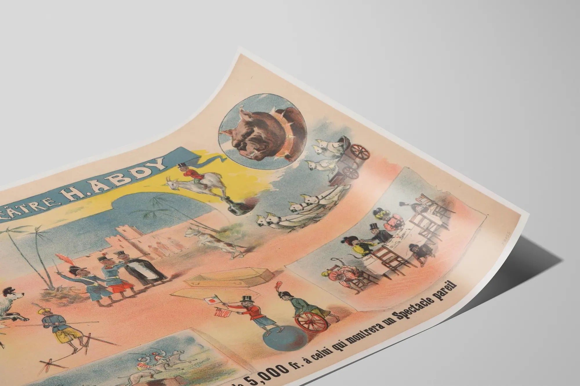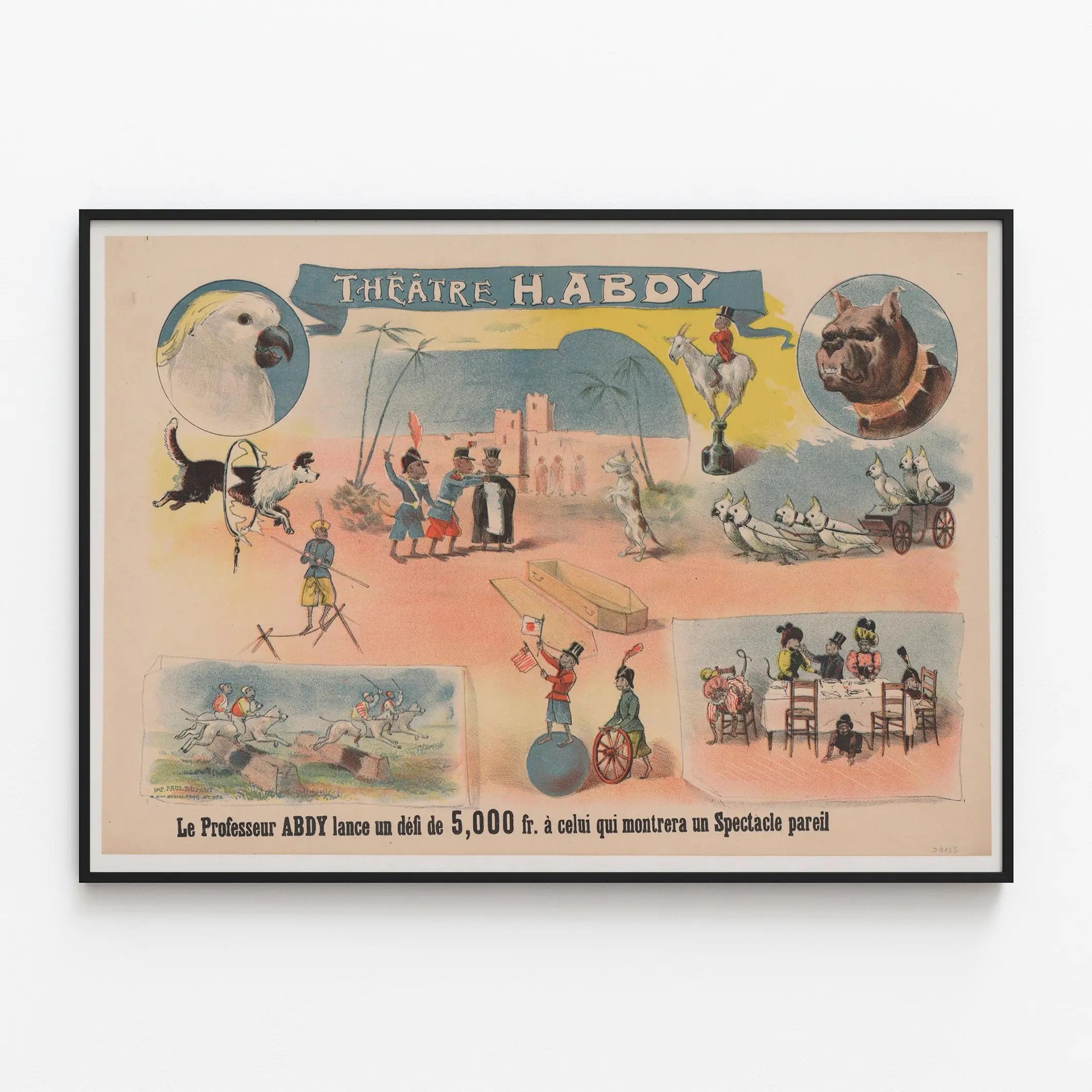 Cette affiche vintage est une pièce emblématique du Théâtre H. Abdy, illustrant le défi lancé par le Professeur Abdy : 5 000 francs à quiconque pourrait présenter un spectacle identique. Ce poster de style ancien capture avec finesse et humour un spectacle mêlant animaux dressés et numéros d'adresse spectaculaire. On y aperçoit divers éléments de la scène théâtrale comme un perroquet, un chien sautant à travers un cerceau, des acteurs en costume d'époque, une chèvre montée par une petite figurine en haut-de-forme et plusieurs cockatoos engagés dans une mise en scène ludique. L'ambiance colorée et délicate de cette décoration murale est parfaite pour les amateurs d'art rétro et d'histoire du spectacle. Affiche ou poster artistique, elle apportera une touche originale et authentique à votre décoration murale. Idéale pour un salon, un bureau ou une salle de spectacle, cette image invite à un voyage dans le temps et dans le monde fascinant des spectacles animaliers et de la performance théâtrale d'antan. La composition équilibrée met en valeur l'animation des personnages et des bêtes dans un décor simple mais évocateur. Ce tableau imprimé offre un bel exemple de lithographie théâtrale utilisée pour annoncer et célébrer des performances uniques, tout en décorant de façon élégante vos murs avec une ambiance pleine d'histoire et de créativité.