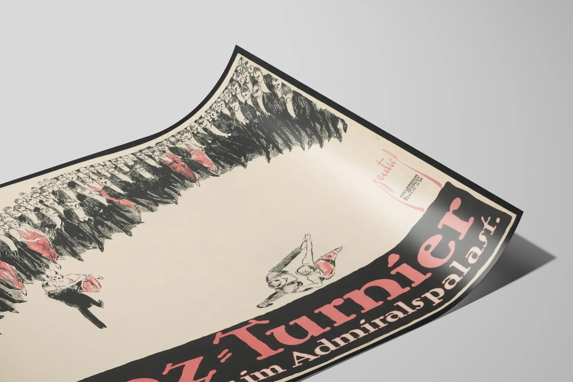 Cette affiche vintage représente un tournoi de danse organisé au Admiralspalast, un lieu emblématique, avec une date précise indiquée au 1er février. La scène animée met en avant plusieurs couples élégamment vêtus dans des costumes de soirée, illustrant différents styles de danse tels que le Onestep, Twostep, Boston, et Tango. Le graphisme est simple mais expressif, utilisant une palette limitée de couleurs dominée par le noir, le rouge et le gris, qui souligne les silhouettes stylisées des danseurs et crée un contraste saisissant. Cette affiche fait office de décoration murale raffinée, idéale pour apporter une touche d'art graphique rétro et une ambiance festive à tout intérieur. Ce poster évoque non seulement l'esthétique du début du XXe siècle, mais aussi la culture dynamique des concours de danse, mélange d'élégance et de rythme. Placé dans un salon, une salle de danse ou un bureau, ce tableau mural capte l'esprit des bals et tournois d'autrefois, insufflant une atmosphère vintage pleine de charme. C'est un élément parfait pour les amateurs de décoration murale qui cherchent à enrichir leur espace avec une pièce graphique et historique, en particulier pour ceux qui apprécient l'esprit des arts vivants et des événements culturels élégants. Ce poster est aussi un cadeau distingué pour les passionnés de danse et de design rétro, apportant une ambiance unique grâce à son style graphique épuré et ses couleurs contrastées.