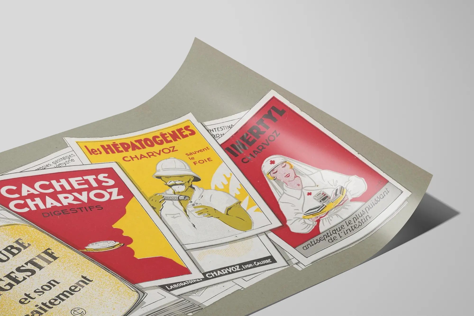 Découvrez cette affiche vintage représentant une collection d'anciens documents médicaux dédiés au tube digestif et à son traitement. Cette décoration murale illustre plusieurs publicités pour des produits pharmaceutiques de la marque Charvoz, spécialisés dans le traitement des troubles digestifs et hépatiques. Sur cette affiche, on note notamment des publicités pour les « Cachets Charvoz digestifs », les « Hépatogènes Charvoz » qui sont présentés comme efficaces pour le foie, ainsi que pour « Linertyl Charvoz », décrit comme un antiseptique puissant pour l’intestin. Chaque document est riche en couleurs vives, avec un rouge vif, un jaune lumineux et un blanc contrastant, offrant un rendu visuel dynamique et authentique. L'ensemble est disposé sur un fond neutre, mettant en valeur ces supports imprimés anciens, qui évoquent l'époque des campagnes médicales illustrées du début du XXe siècle. Cette affiche est idéale pour une décoration murale originale dans un cabinet médical, une pharmacie, ou même pour les passionnés d'objets et d'affiches rétro sur le thème de la santé et du corps humain. Le style graphique met en avant un mélange d'illustrations figuratives et de typographies fortes, rappelant un marketing d’antan centré sur la prise en charge du système digestif. Offrez à vos murs une touche d'histoire médicale à travers ce poster vintage qui fera également un clin d’œil aux amateurs de design rétro et d'art publicitaire.