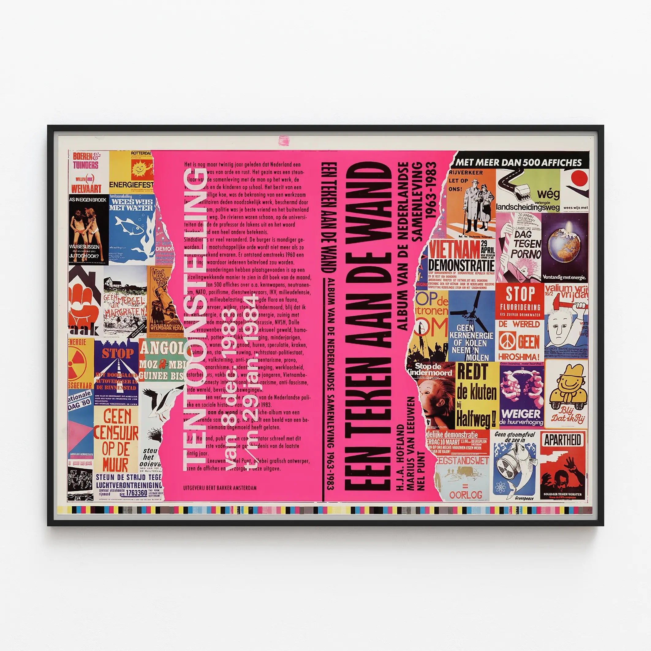 Cette affiche vintage intitulée « Een Teken aan de Wand » est une pièce unique de décoration murale qui capture l’esprit contestataire et les luttes sociales aux Pays-Bas entre 1963 et 1983. Avec un design chargé de multiples petites affiches colorées et symboliques, elle offre un aperçu riche et détaillé de la protestation politique et sociale de cette époque. Cette affiche est idéale pour les amateurs d’histoire, de culture politique, ainsi que pour ceux qui cherchent à ajouter une touche rétro et engagée à leur intérieur. Ce poster se distingue par son assemblage de messages politiques variés et forts, allant de manifestations pacifiques à des appels à la paix, à l’écologie et aux droits humains. On y retrouve notamment des slogans contre la censure, le nucléaire, l’énergie fossile, ainsi que des références à des événements marquants comme les manifestations vietnamiennes, les luttes féministes, et le combat contre l'apartheid. Ce patchwork visuel est une véritable plongée dans un album de société aux prises avec des enjeux globaux et locaux à la fois. Très colorée, cette affiche est également une œuvre graphique remarquable grâce à son utilisation intensive du rose vif, contrasté par des encarts noirs, blancs, et toutes sortes de teintes vives et saturées. Les nombreux textes, symboles et images rendent chaque visite visuelle riche en découvertes, presque comme un collage mural où chaque élément raconte une histoire. C’est une proposition forte en décoration murale, parfaite pour un séjour, un bureau ou un espace culturel. Au-delà de son aspect décoratif, ce poster invite à la réflexion et à la discussion. Il témoigne des revendications citoyennes telles que la paix, la coopération, la tolérance, le droit de manifester et la prise de conscience écologique. Accrocher cette affiche au mur, c’est faire le choix d'un décor engagé, qui interpelle et inspire, rappelant que les murs peuvent aussi être une toile d’expression politique et sociale. Convient aussi bien aux espaces modernes qu’aux ambiances vintage ou industrielles, ce tableau mural fonctionne comme un élément centré d’une composition décorative originale. Sa taille et son format offrent un impact visuel important tout en restant accessible pour un usage intérieur. En résumé, cet objet décoratif est une invitation visuelle à revisiter deux décennies de luttes sociétales à travers un collage d’affiches qui ont marqué les esprits.