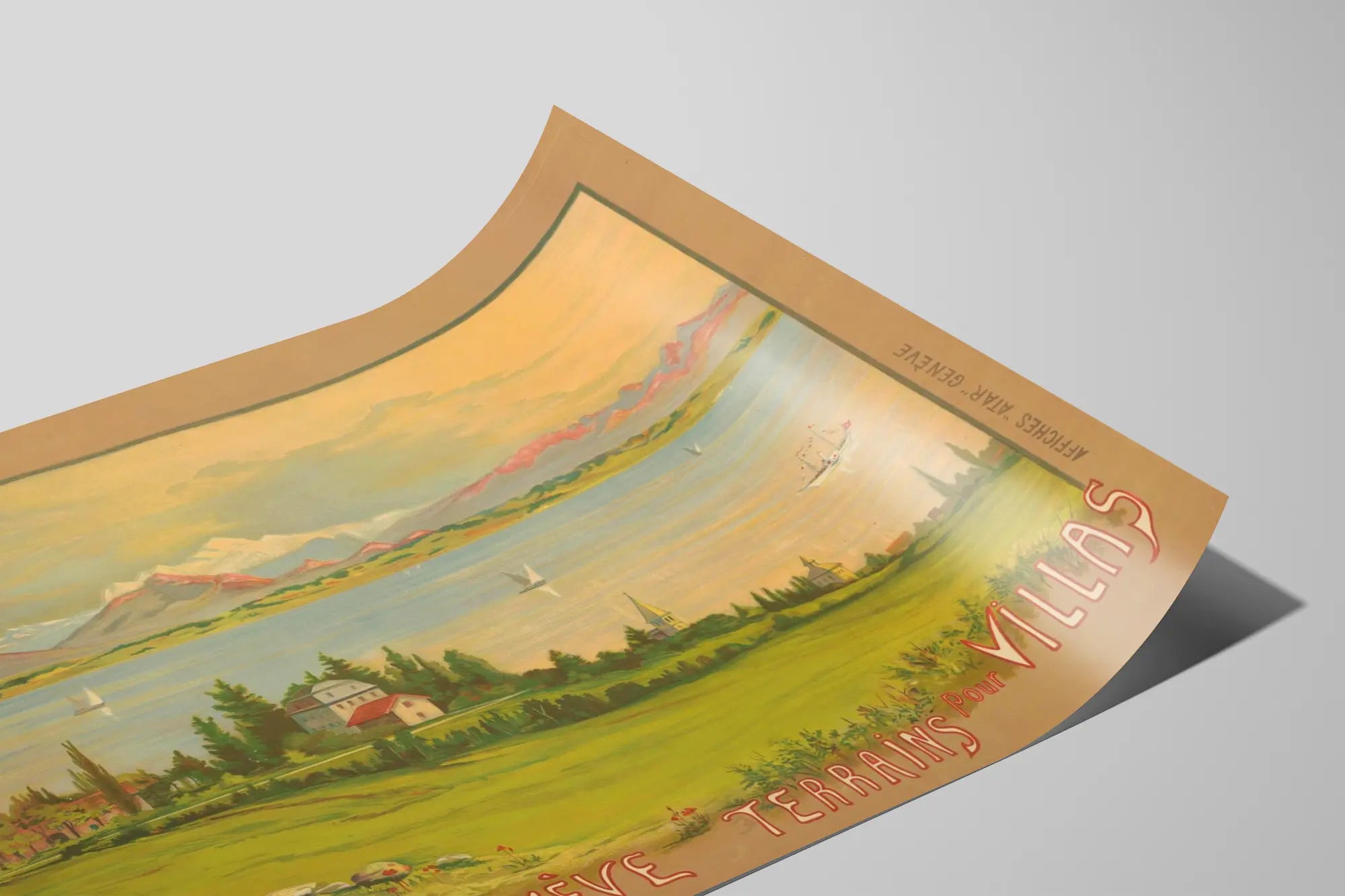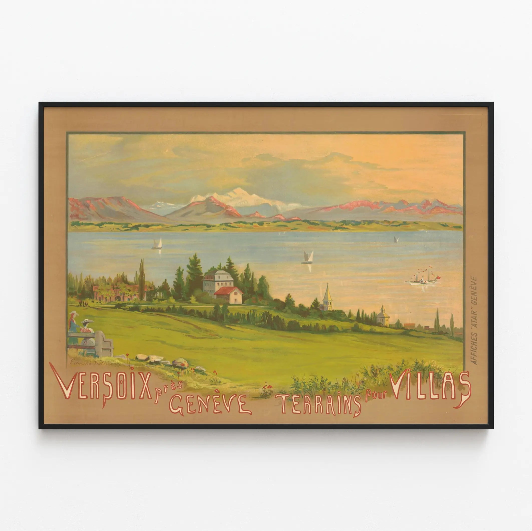 Cette affiche vintage illustre un paysage pittoresque de Versoix, une charmante localité proche de Genève, mettant en avant des terrains destinés à la construction de villas. Cette décoration murale capture une vue apaisante avec un vaste espace vert en premier plan idéal pour les projets immobiliers, accompagné d'un panorama lacustre où flottent quelques voiliers et un bateau à vapeur, renforçant l'ambiance paisible et prestigieuse du lieu. En arrière-plan, on aperçoit une chaîne de montagnes aux sommets enneigés, qui ajoute une profondeur visuelle spectaculaire et une touche de nature grandiose à la composition. Cette affiche se distingue par son style artistique classique, à la fois doux et coloré, évoquant le charme intemporel des paysages suisses traditionnels. L'inscription manuscrite en lettres rouges et blanches valorise le message commercial de cette annonce ancienne, soulignant l'opportunité d'acquérir un terrain dans cette région attractive à proximité de Genève. En décor mural, ce poster vintage est parfait pour apporter une note élégante et nostalgique à un salon, un bureau ou un espace d'accueil, en particulier pour les amateurs de décoration évoquant le patrimoine et la beauté naturelle des régions alpines. Ce tableau mural s'intègrera harmonieusement dans un intérieur recherchant une ambiance à la fois classique et chaleureuse, offrant une fenêtre ouverte sur un cadre de vie serein au bord du lac Léman. L'affiche peut aussi séduire les passionnés d'histoire locale et d'urbanisme ancien, grâce à son caractère informatif et esthétique. Grâce à sa qualité visuelle et à son sujet évocateur, cette pièce de décoration murale est un choix original pour personnaliser un espace avec une touche de caractère et d'authenticité.