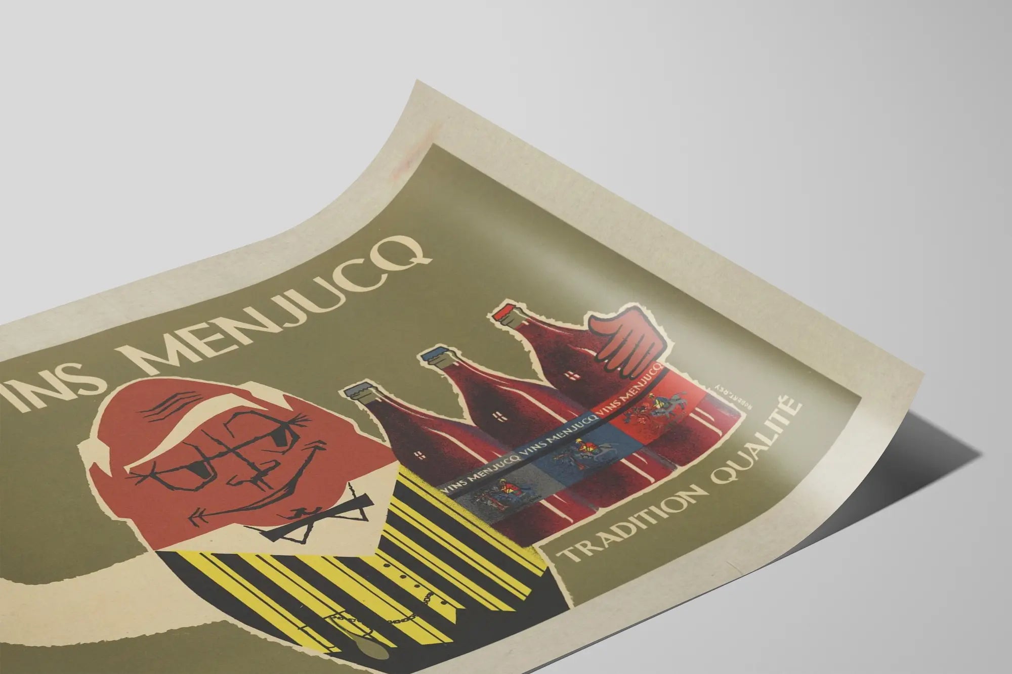 Apportez une touche rétro et authentique à votre décoration murale avec cette affiche vintage représentant les Vins Menjucq, synonyme de tradition et de qualité. Ce poster met en scène un personnage caricatural, habillé d'un gilet jaune à rayures noires, arborant un verre de vin rouge levé en signe de célébration. À ses côtés, trois bouteilles de vin rouge aux étiquettes colorées captivent l'attention, soulignant l'identité visuelle unique de la marque Menjucq. Sur un fond olive discret, le texte "VINS MENJUCQ" trône en haut de l'affiche tandis qu'en bas, les mots "TRADITION QUALITÉ" renforcent le message de fiabilité et d'authenticité associé à ces vins. Cette affiche publicitaire, au style graphique simple mais expressif, est une décoration murale idéale pour les amateurs d'art vintage, les passionnés de vin, ou toute personne cherchant à embellir un espace de vie ou un bar à la maison. Son design charmant et son ambiance élégante en font un tableau original qui capte le regard et suscite la nostalgie d'une époque où la tradition et la qualité dictaient la passion des vins. Parfaite pour un intérieur au style rétro, cette décoration murale invite à la convivialité et à la découverte du patrimoine viticole à travers une illustration emblématique.