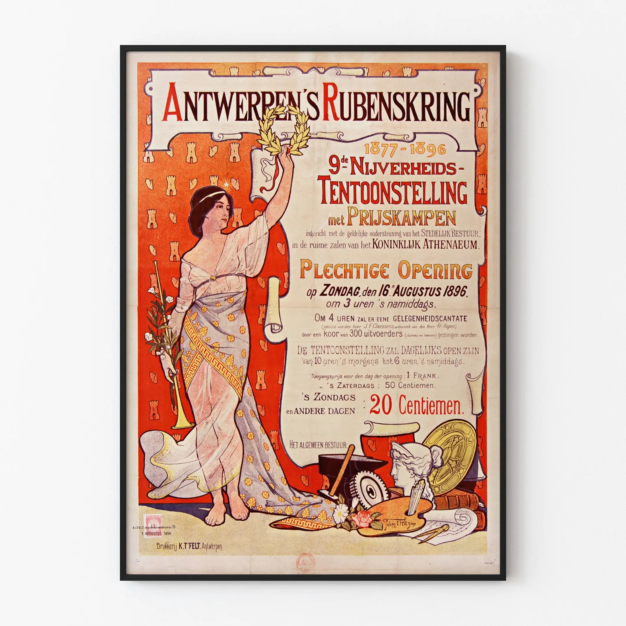 Póster antiguo de la 9ª exposición industrial Antwerpens Rubenskring 1896