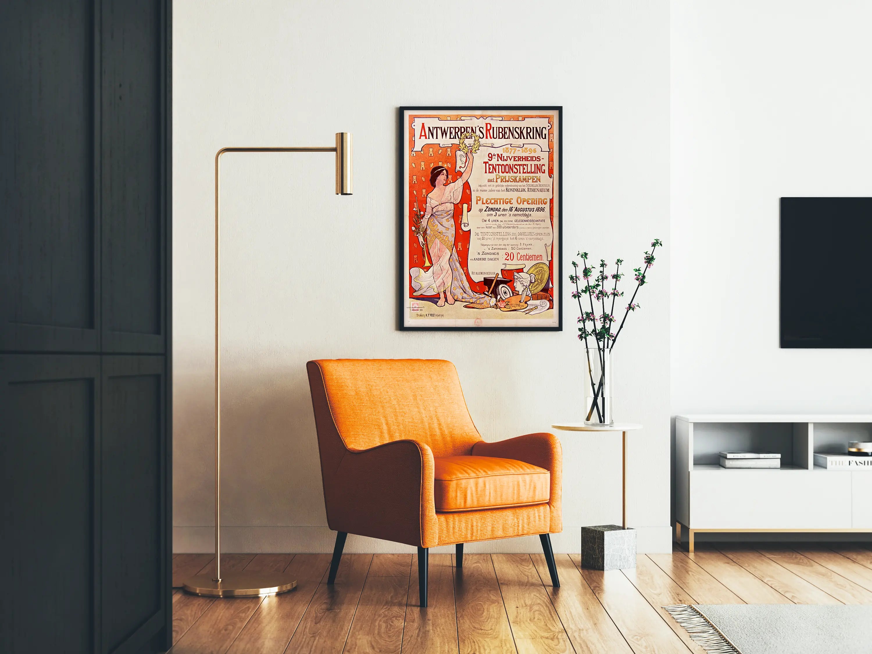 Este cartel vintage es una decoración mural única, que ilustra la novena exposición industrial organizada por el Anvers Rubenskring entre 1877 y 1896. Su estilo artístico retro, con una paleta de colores cálidos dominada por tonos anaranjados y rojos, lo convierte en un cartel decorativo ideal para aportar un toque de elegancia histórica a sus paredes. En este cartel, una figura femenina velada con vestimenta clásica sostiene una corona de laurel, símbolo de la victoria, mientras que a su alrededor se dibujan varios elementos representativos del arte y la industria, como herramientas, una paleta de pintura y medallas, evocando la mezcla entre creatividad artística y saber hacer industrial de la época. Este cuadro mural impreso combina textos e ilustraciones en una composición cuidada, con una tipografía antigua característica de los carteles de los años 1890, lo que lo convierte en un excelente elemento para una decoración mural vintage y auténtica. Adaptado para enmarcar o colocar tal cual, este cartel aporta un ambiente cálido e histórico a cualquier espacio, ya sea una sala de estar, una oficina o un espacio dedicado al arte y la cultura. Al elegir este cartel, opta por una pieza de decoración mural que cuenta una historia, la de una época en la que el arte y la industria se fusionaban para celebrar la innovación y la creatividad. Este cartel es perfecto para los amantes de la historia, del diseño gráfico antiguo, y para quienes desean enriquecer su interior con un cartel de estilo retro distintivo y cargado de símbolos. Una invitación a descubrir un aspecto cultural expuesto en el marco del Koninklijk Athenaeum de Amberes, este objeto de decoración mural combina estética y patrimonio en un formato ideal para realzar sus paredes con autenticidad.