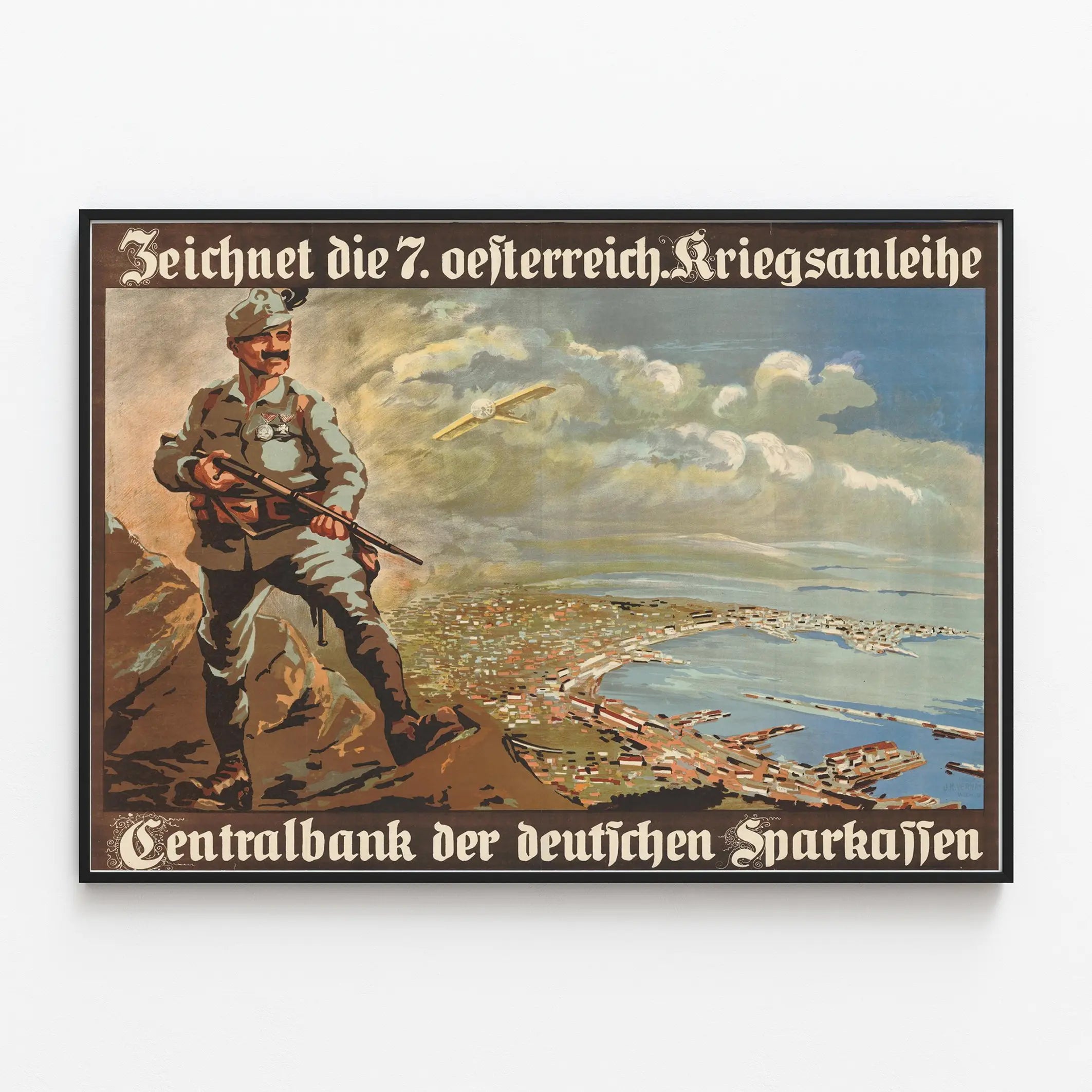 Este cartel histórico es un ejemplo destacado de decoración mural vintage, que ilustra a un soldado austriaco con uniforme de época, de pie sobre una roca con un fusil en mano, dominando una vista panorámica de una ciudad costera con un puerto animado. Este elemento de decoración mural presenta un avión volando en un cielo parcialmente nublado, reforzando el tema militar y aéreo de la imagen. El texto en la parte superior e inferior del cartel, en caracteres góticos, invita a suscribirse a la séptima emisión de bonos de guerra austriacos, destacando el llamamiento patriótico para financiar el esfuerzo bélico. Este cartel histórico combina elementos gráficos y tipográficos para crear una atmósfera auténtica y evocadora, perfecta para los amantes de la decoración mural con temática vintage, militar o histórica. Colocado en una sala de estar, una oficina o una biblioteca, este cartel aporta un toque de historia y carácter, transformando cualquier espacio en un lugar lleno de recuerdos. Esta impresión en cuadro es una opción decorativa única para quienes desean incorporar una pieza impregnada de simbolismo e historia en su colección o decoración.