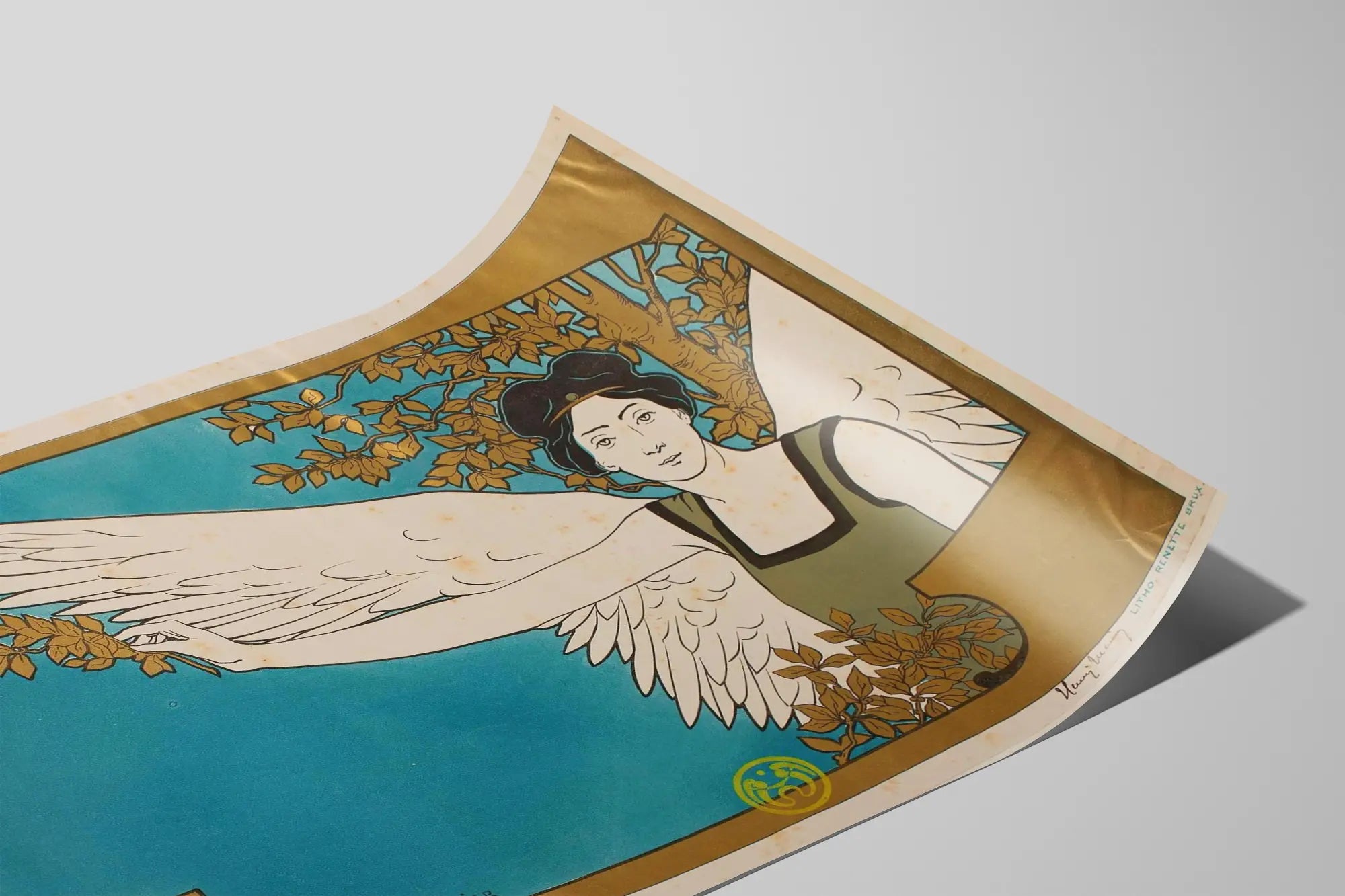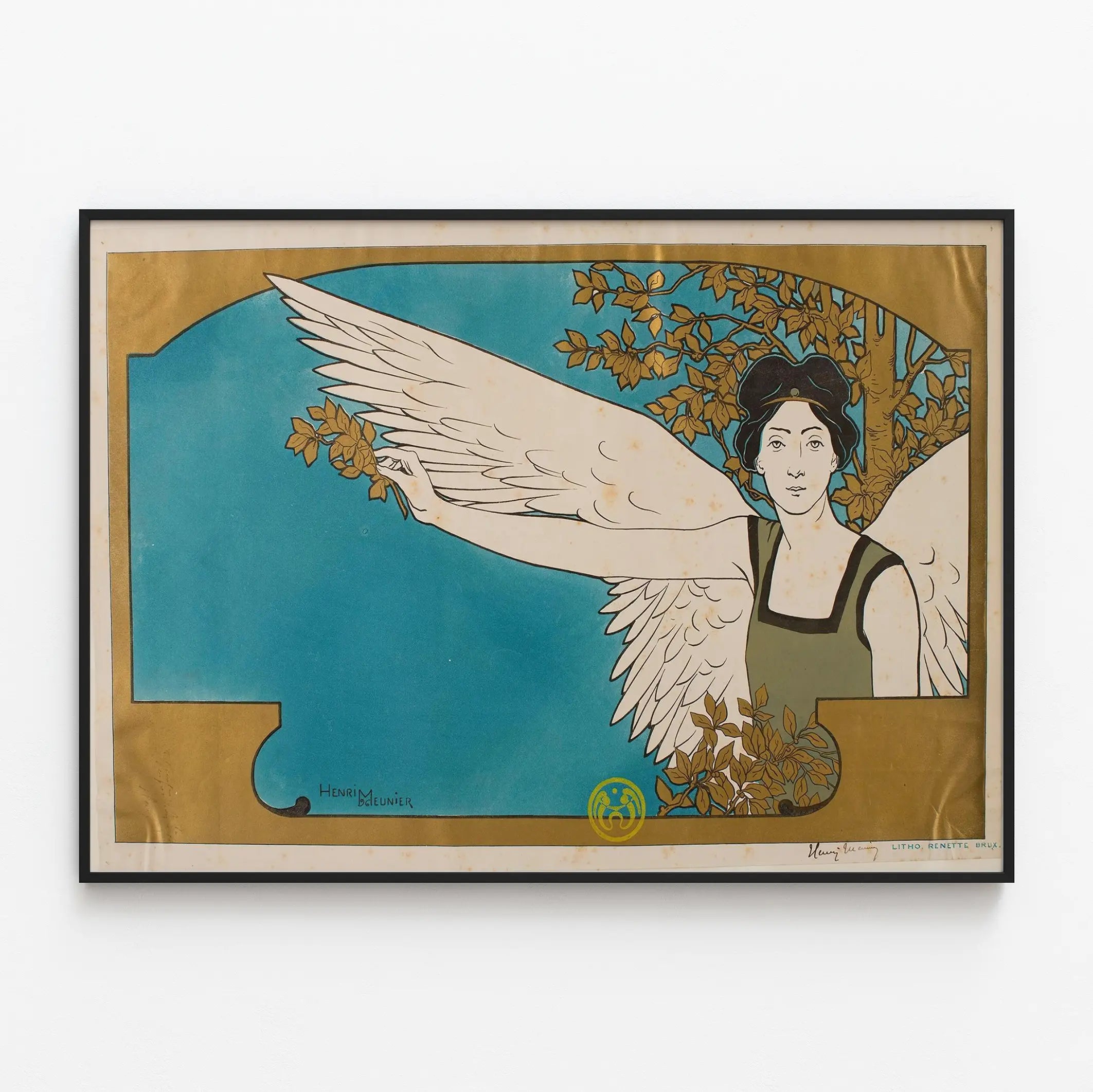 Descubra esta elegante cartel de Arte Nouveau titulado 'La Guía Musical', una pieza decorativa para la pared firmada por Henri Meunier. Este cartel presenta una figura femenina alada, símbolo de inspiración y musa, que se destaca sobre un fondo azul celeste enmarcado en oro. El estilo gráfico, característico de principios del siglo XX, combina la finura de las líneas con una selección de colores armoniosos, ofreciendo un resultado visual a la vez sobrio y refinado. Esta decoración mural, impresa en litografía, es un ejemplo emblemático de la época del Arte Nouveau, ideal para los amantes del arte y la música que desean embellecer su interior con un cartel lleno de carácter y poesía visual. Perfecto para enmarcar, esta obra aporta un toque de elegancia e historia a cualquier espacio, ya sea una sala de estar, una oficina o una sala de música. Su composición artísticamente equilibrada, entre la delicadeza de la figura y la presencia marcada de la naturaleza a su alrededor, la convierte en una obra que atrae la mirada y invita a la contemplación. Adopte este cartel 'La Guía Musical' para infundir un espíritu vintage y cultural en su decoración mural, al mismo tiempo que resalta un trabajo artístico tradicional de gran finura. Este cartel cautivará a todos aquellos que aprecian la unión entre arte gráfico y elementos naturales, sublimada por un estilo único y atemporal.