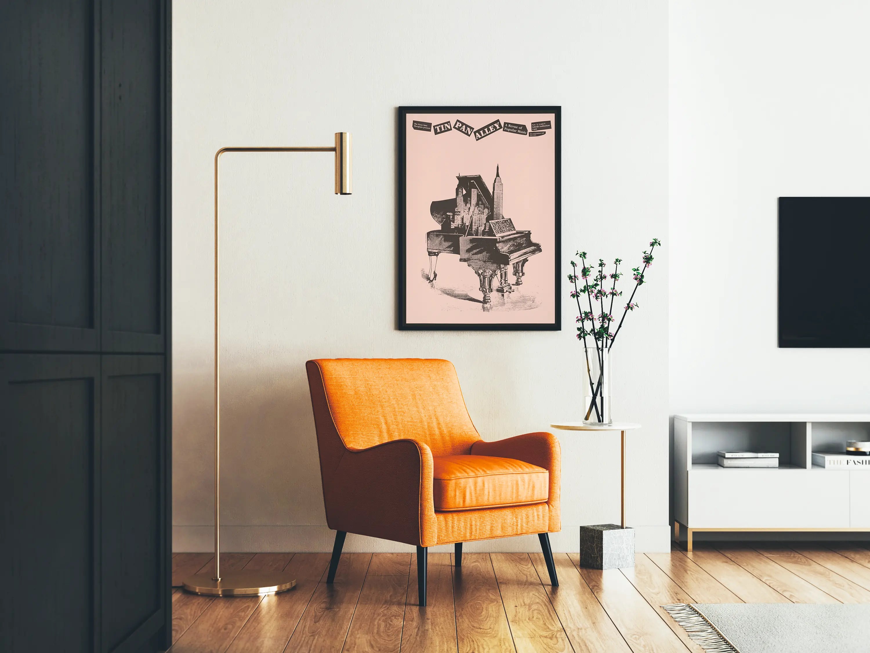 Esta cartel artístico estilizado presenta un piano de cola cuya tapa se abre para revelar una silueta urbana, evocando un paisaje de rascacielos. Esta representación gráfica original simboliza la fusión entre la música popular y el ambiente de las grandes ciudades, un homenaje visual a la famosa revista musical "Tin Pan Alley". Sobre un fondo liso de color rosa pálido, el negro de la ilustración crea un contraste marcado que capta la atención y aporta un toque elegante a esta decoración mural.