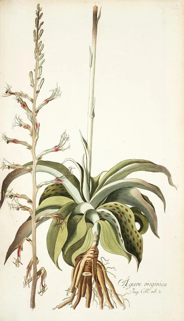 Nikolaus Joseph Freiherr von Jacquin, botánico y artista del siglo XVIII, desempeñó un papel esencial en la ilustración científica de las plantas. Formado en Viena, fue influenciado por los grandes naturalistas de su época y viajó a las colonias para estudiar la flora exótica. Su trabajo contribuyó al conocimiento de las especies vegetales y al auge de la botánica como disciplina. "Agave virginica" se inscribe en un período donde el arte y la ciencia se unen, testimoniando la importancia de la observación minuciosa y de la representación fiel de las plantas.