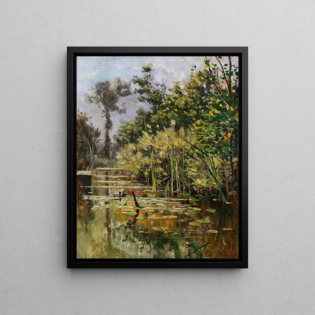 Karl Hagemeister es un pintor paisajista alemán del siglo XIX, conocido por sus representaciones poéticas de la naturaleza. En 'Altwasser con patos en otoño', captura la belleza serena de un paisaje otoñal, donde la luz dorada del sol se refleja en el agua tranquila, creando un ambiente pacífico. Los patos, que añaden un toque de vida a la escena, están pintados con un cuidado especial, evidenciando la observación minuciosa del artista. Esta obra, además de ser una celebración de la naturaleza, también evoca sentimientos de nostalgia y tranquilidad. Hoy en día, puede aportar un toque cálido y acogedor a cualquier espacio interior. Le invitamos a explorar la impresión artística de esta obra en Artem Legrand.