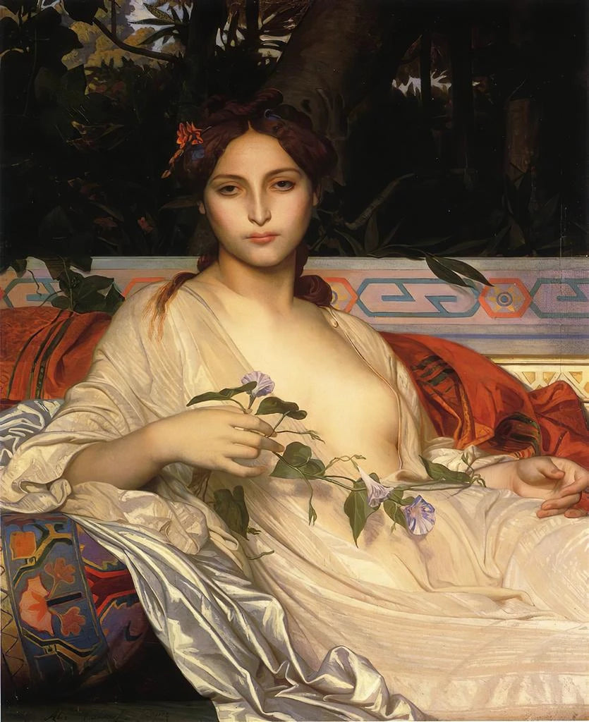 El estilo de Cabanel se caracteriza por un realismo impactante y una paleta de colores delicados. En "Albayde", la finura de los detalles y la suavidad de los rasgos son notables. La luz parece bailar sobre la piel de la figura central, acentuando sus curvas y resaltando la voluptuosidad de su postura. Los pliegues de su vestimenta, cuidadosamente realizados, añaden una dimensión táctil a la obra, mientras que el fondo difuso permite concentrar la atención en la belleza del sujeto. Cabanel juega hábilmente con las sombras y las luces, creando un efecto de profundidad que da vida a su composición. La manera en que captura las emociones y pensamientos de sus personajes es una marca de fábrica que distingue su arte, y "Albayde" es una ilustración perfecta.