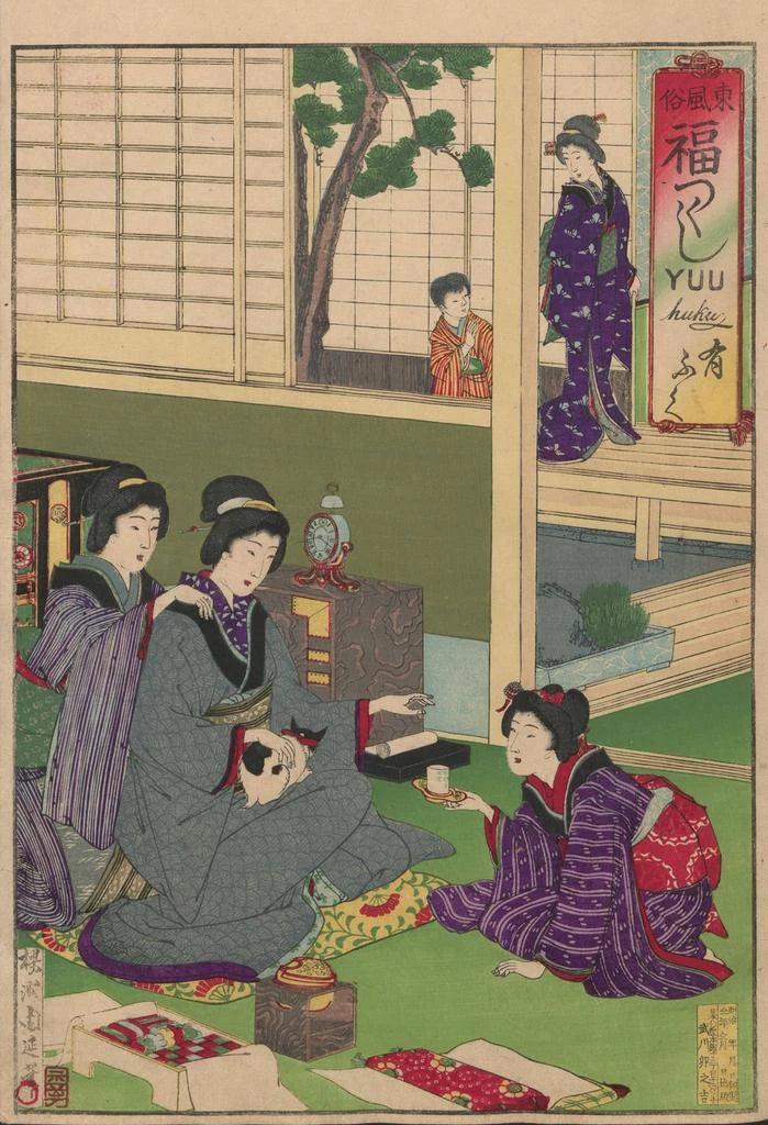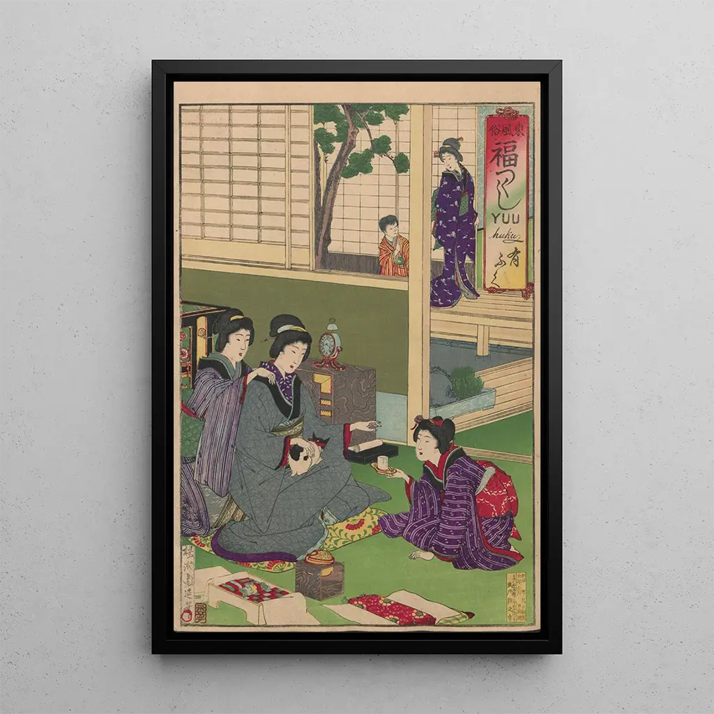"" de Toyohara Chikanobu es una obra que celebra la belleza efímera de las estaciones y las tradiciones japonesas. Los colores vibrantes y los motivos delicados se combinan para crear una escena viva, donde cada detalle parece contar una historia. La técnica de la xilografía, dominada por Chikanobu, permite una precisión notable y una profundidad visual que cautivan la mirada. Esta impresión artística evoca una atmósfera de tranquilidad, invitando a la contemplación y a la evasión en un mundo impregnado de poesía.