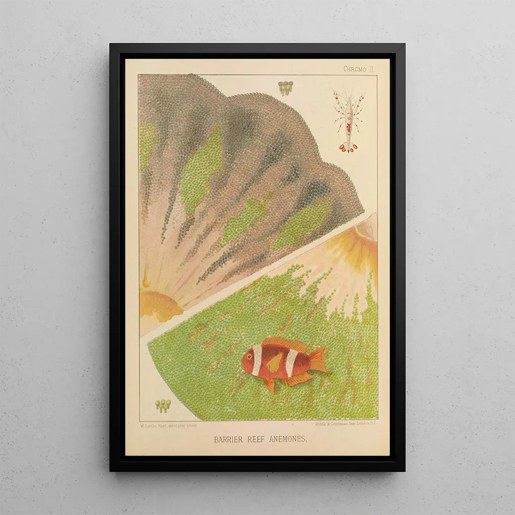 En esta impresión artística de Anémones de la barrera de coral II, William Saville-Kent nos sumerge en un universo submarino vibrante y colorido. Los tonos brillantes de las anémonas, que van del rosa al violeta, contrastan con las tonalidades de azul del agua, creando una composición dinámica y cautivadora. La técnica del artista, que combina realismo y toques impresionistas, permite sentir la vida que bulle en este ecosistema marino. Este cuadro evoca la belleza frágil de los fondos marinos y nos recuerda la importancia de su conservación.