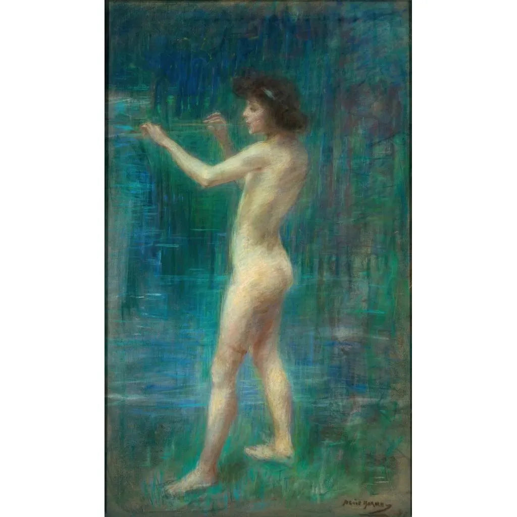 "Arcadia" de Alice Pike Barney evoca un paisaje idílico donde la naturaleza y la humanidad coexisten en perfecta armonía. Esta obra, bañada en luz, representa una escena tranquila donde figuras femeninas se funden en un decorado verde. Los colores vivos y los toques impresionistas insuflan vitalidad a la obra, creando una atmósfera de ensueño y tranquilidad. La técnica de la artista, que combina realismo y elementos simbolistas, nos transporta a un mundo donde el tiempo parece suspendido, invitando a la ensoñación y a la evasión.