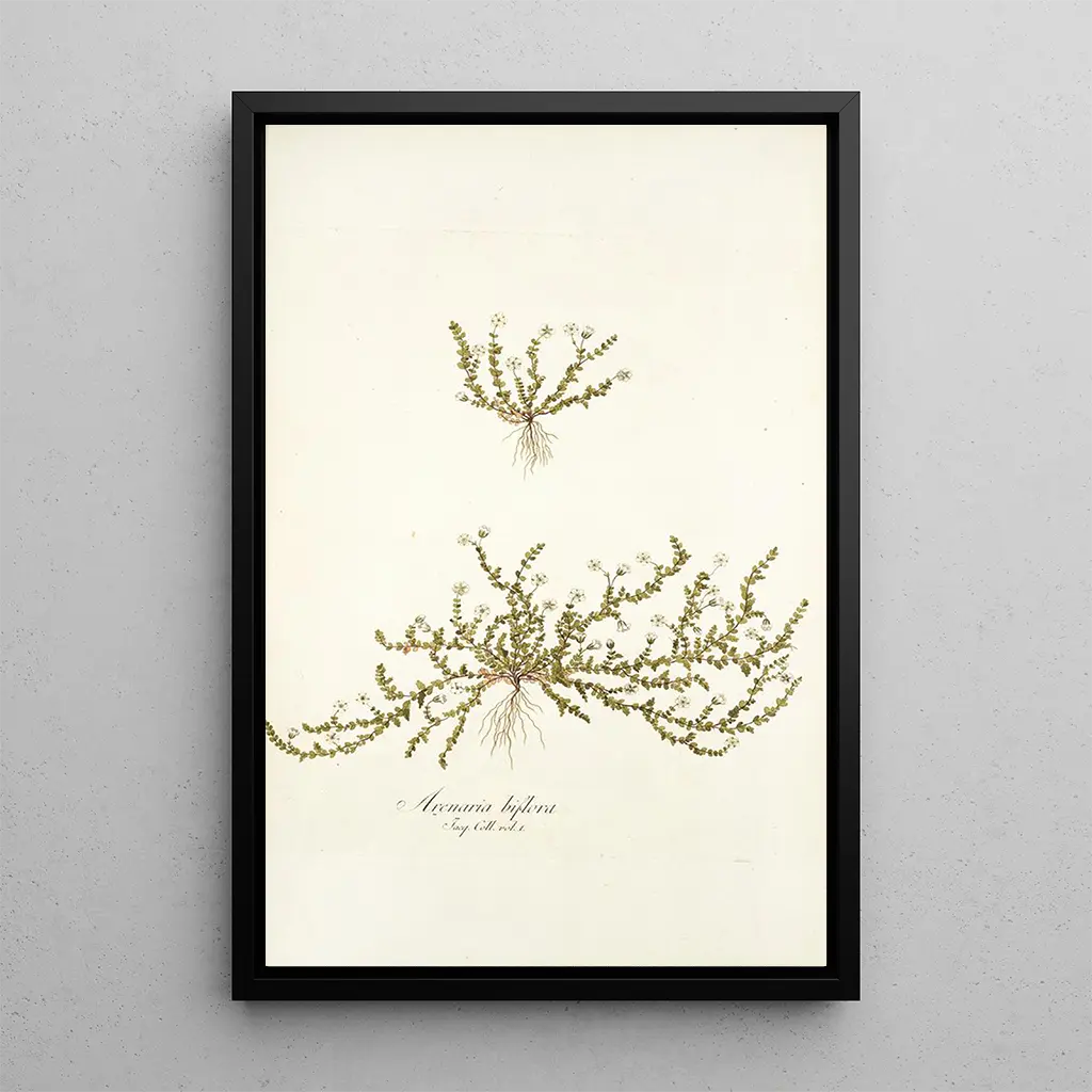 Nikolaus Joseph Freiherr von Jacquin, botánico y artista austriaco del siglo XVIII, marcó su época con sus contribuciones a la botánica y al arte. Sus viajes le permitieron descubrir numerosas especies vegetales, que posteriormente documentó con un cuidado del detalle notable. Influenciado por las corrientes científicas de su tiempo, Jacquin supo combinar rigor y creatividad, haciendo de sus obras referencias en el campo de la ilustración botánica. La impresión artística de Arenaria biflora ilustra perfectamente su talento, combinando precisión científica y estética refinada.