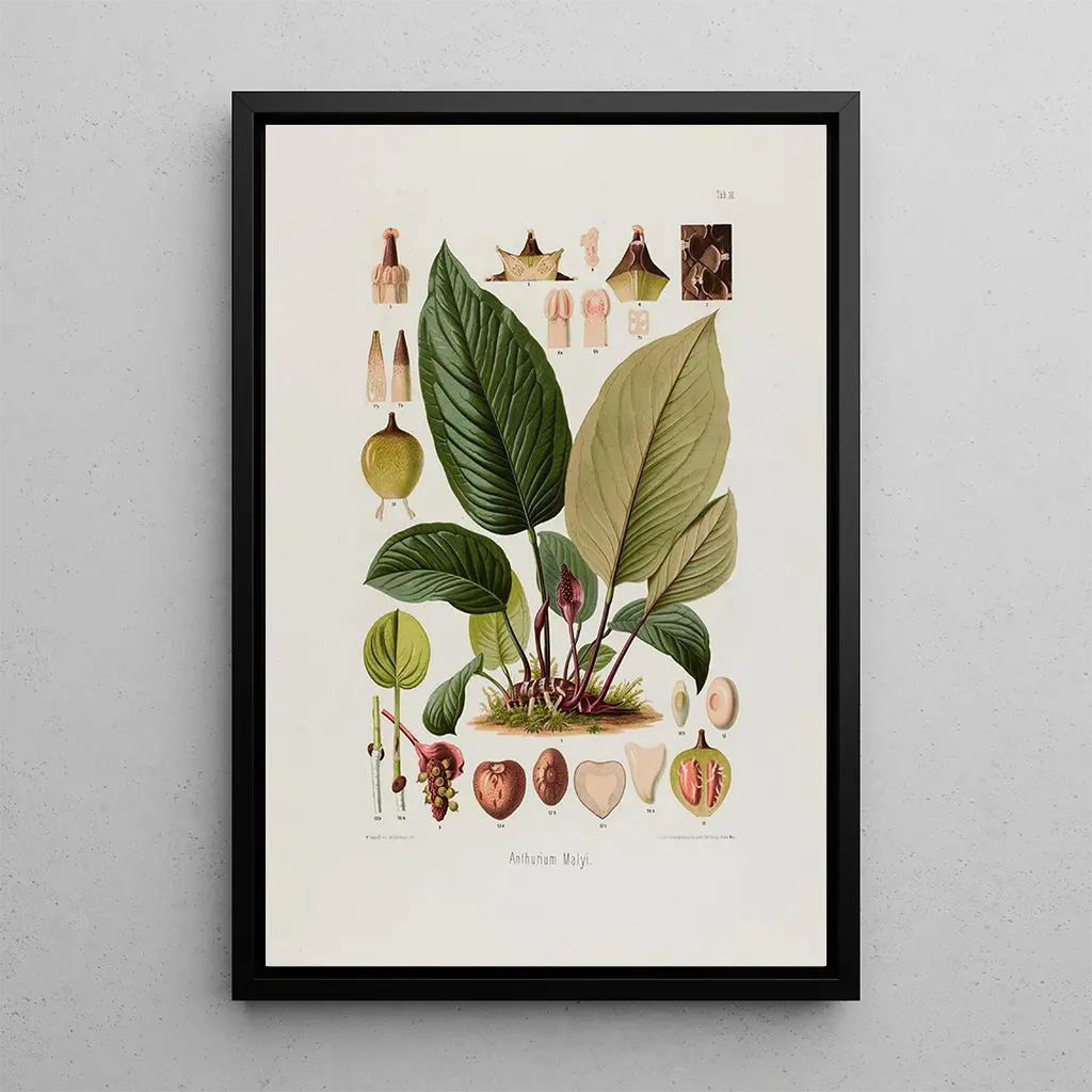 Aroideae Maximilianae Pl10 : una celebración de la naturaleza exótica La impresión artística Aroideae Maximilianae Pl10 es una obra fascinante que sumerge al espectador en el universo exuberante de las plantas tropicales. Los colores vibrantes, que van desde verdes profundos hasta matices brillantes de amarillo y violeta, crean una atmósfera a la vez relajante y estimulante. La técnica de grabado utilizada por el artista permite reproducir cada detalle de las hojas y las flores con una precisión notable, ofreciendo una visión casi táctil de esta planta rara. Este lienzo invita a la contemplación y a la admiración ante la belleza de la naturaleza, evocando al mismo tiempo un sentimiento de exotismo y descubrimiento. Heinrich Wilhelm Schott : un pionero de la botánica artística Heinrich Wilhelm Schott, botánico y artista del siglo XIX, es reconocido por sus contribuciones al estudio y a la representación de las plantas tropicales. Nacido en 1794, dedicó su vida a explorar las riquezas botánicas de América del Sur y de las islas de Indonesia. Influenciado por las corrientes científicas de su época, Schott supo combinar rigor científico y sensibilidad artística, lo que le permitió crear obras de gran valor estético e informativo. La impresión artística Aroideae Maximilianae Pl10 forma parte de sus trabajos más emblemáticos, evidenciando la importancia de la botánica en el arte y la interconexión entre ciencia y creatividad. Una adquisición decorativa con múltiples ventajas La impresión artística Aroideae Maximilianae Pl10 es una pieza decorativa ideal para enriquecer su interior, ya sea en una sala de estar, una oficina o un dormitorio. Su calidad de impresión y fidelidad a los colores originales la convierten en una elección perfecta para quienes desean aportar un toque de naturaleza a su espacio vital. Con su atractivo estético indiscutible, este cuadro cautivará a los amantes de la botánica y del arte, integrándose armoniosamente en diversos estilos de decoración. Adquiera esta obra para transformar su entorno en un refugio de paz y elegancia.