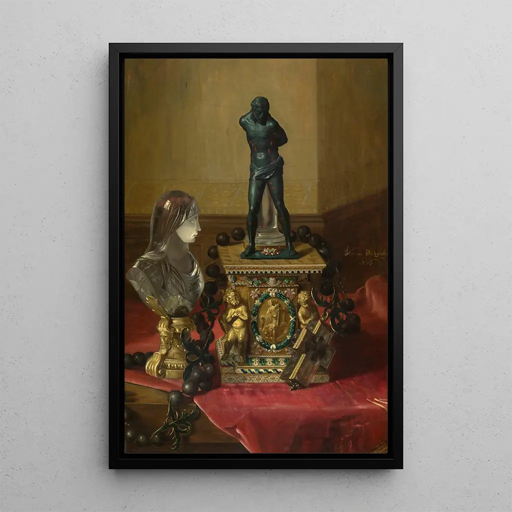 La impresión artística en el Louvre de Blaise-Alexandre Desgoffe nos sumerge en un universo donde la belleza se oculta en los detalles de lo cotidiano. Esta obra cautivadora se distingue por su composición armoniosa, donde los objetos cotidianos se destacan con una delicadeza notable. Los colores cálidos y ricos, que van desde los marrones profundos hasta los dorados brillantes, crean una atmósfera a la vez íntima y acogedora. La técnica de la pintura al óleo, dominada por Desgoffe, permite representar cada textura con una precisión asombrosa, invitando al espectador a apreciar la belleza de las cosas simples. Este cuadro es una verdadera oda a la contemplación, donde cada elemento cuenta una historia.