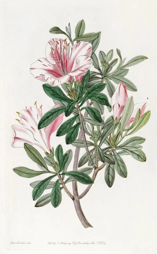 "La azalea china multicolor" de Sydenham Edwards es una obra que celebra la belleza efímera de las flores. Los tonos pastel, que van desde el rosa suave hasta el blanco brillante, se combinan con gracia, creando un cuadro de gran ligereza. La técnica de la acuarela permite reproducir la transparencia de los pétalos y la suavidad de las formas, evocando un sentimiento de paz y contemplación. Esta obra invita a apreciar la delicadeza de la naturaleza y a maravillarse ante la espléndida belleza de las azaleas, símbolos de belleza y renovación.