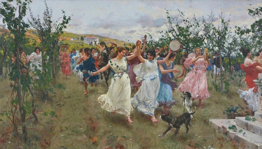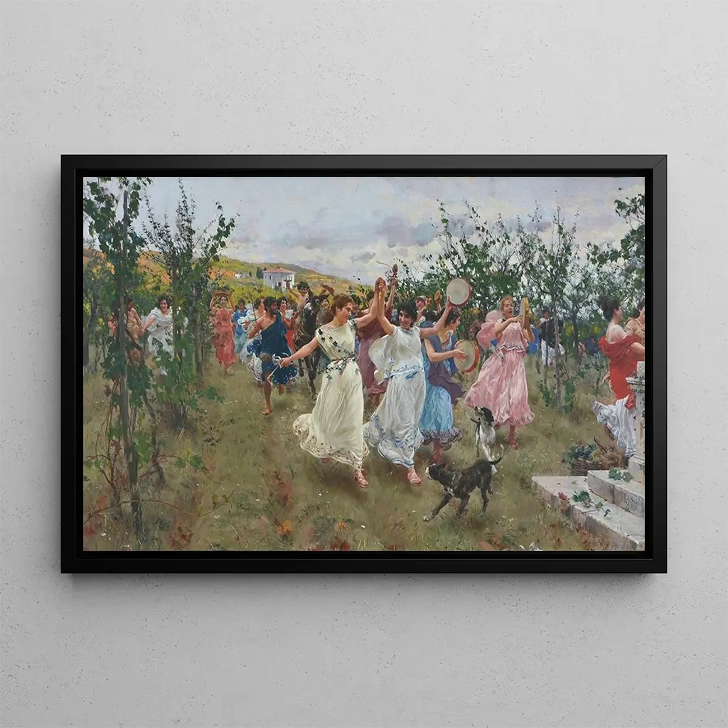 La impresión artística de Bacanal, realizada por Raffaello Sorbi, evoca una escena vibrante y festiva, donde la naturaleza y la humanidad se unen en una danza desenfrenada. Los personajes, vestidos con drapeados coloridos, participan en festividades, rodeados de frutas y vides exuberantes. Los colores brillantes y los movimientos dinámicos transmiten una energía palpable a la obra. Sorbi, con su dominio de las luces y las sombras, logra crear una atmósfera de celebración, donde la alegría de vivir alcanza su punto máximo. Cada detalle, desde las expresiones faciales hasta los gestos elegantes, refleja la pasión del artista por la vida y la belleza.