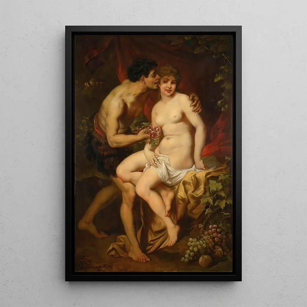 La impresión artística de Bacchus, obra emblemática de Carl Schweninger, evoca una atmósfera festiva y alegre. Los colores vibrantes, que van desde verdes exuberantes hasta dorados brillantes, crean un contraste impactante que atrae inmediatamente la mirada. La técnica del artista, combinando realismo y toques impresionistas, da vida a esta escena mitológica donde Bacchus, el dios del vino, está rodeado de ninfas y frutas. La obra transmite una sensación de movimiento y ligereza, como si casi se pudieran escuchar las risas y los cantos de los invitados. Este lienzo invita a la contemplación y a la evasión, transportando al espectador a un mundo de delicias.