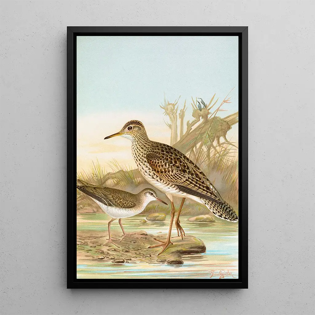 La impresión artística de Bartramia longicauda Tringoides macularius evoca una escena vibrante de la naturaleza, donde los matices de verde y azul se mezclan armoniosamente. La técnica de acuarela utilizada por el artista permite capturar la ligereza de los plumajes y la delicadeza de las formas. Cada detalle, desde las plumas hasta los reflejos en el agua, contribuye a crear una atmósfera relajante y contemplativa. Este cuadro invita a una inmersión en un mundo donde la belleza de la fauna se destaca, rindiendo homenaje a la riqueza de la biodiversidad.