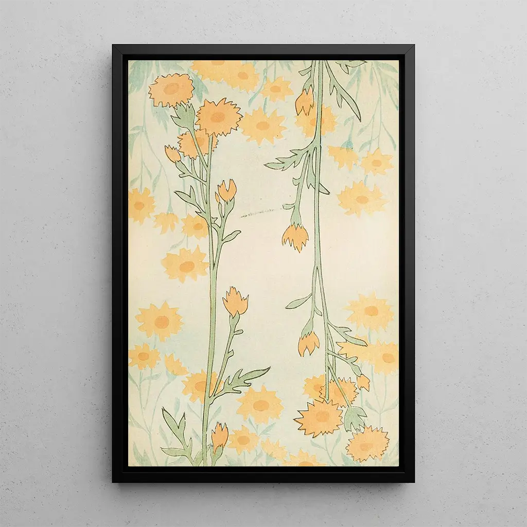 La impresión artística de Bijutsukai Pl40 ofrece una inmersión en un mundo donde los colores vibrantes y las formas delicadas se entrelazan con gracia. Esta obra, realizada por Furuya Korin, evoca una atmósfera pacífica y contemplativa, donde cada detalle parece contar una historia. Las tonalidades de azul y dorado se combinan armoniosamente, creando un cuadro cautivador que atrae la mirada e invita a la reflexión. La técnica del artista, combinando acuarela y tinta, da vida a motivos florales que bailan sobre el lienzo, revelando la maestría de Korin en el arte de la composición.