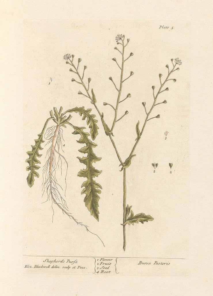 Elizabeth Blackwell, ilustradora botánica del siglo XVIII, marcó su época con su trabajo innovador. Como mujer en un campo dominado por hombres, supo imponerse gracias a su talento y pasión por la botánica. Su obra, "Bourse-à-pasteur", se inscribe en un contexto donde el estudio de las plantas y su representación artística adquieren mayor importancia. Influenciada por las corrientes naturalistas, Blackwell logró combinar rigor científico y sensibilidad artística, convirtiéndola en una figura emblemática de la ilustración botánica.
