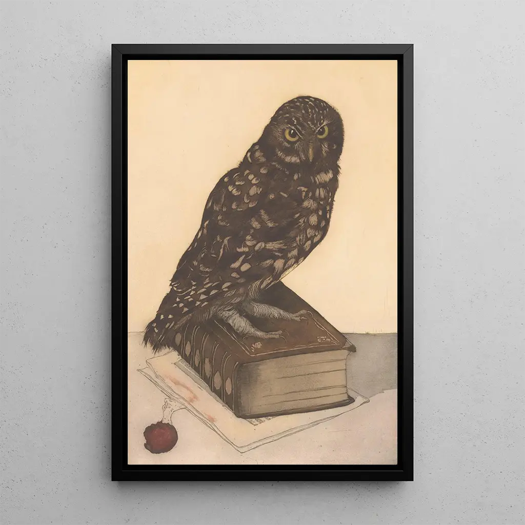 La impresión artística del hibou sentado sobre un libro de Frans Everbag captura la esencia misma de la sabiduría y el misterio. El ave, majestuosa y atenta, parece velar por el conocimiento contenido en las páginas del libro. Las tonalidades de marrón y beige de su plumaje se combinan armoniosamente con los tonos cálidos del libro, creando una atmósfera a la vez relajante e intrigante. La composición equilibrada, donde el hibou es el punto focal, atrae inmediatamente la mirada e invita a la reflexión. Esta obra es una celebración del conocimiento y de la naturaleza, un verdadero homenaje a la belleza del mundo animal.