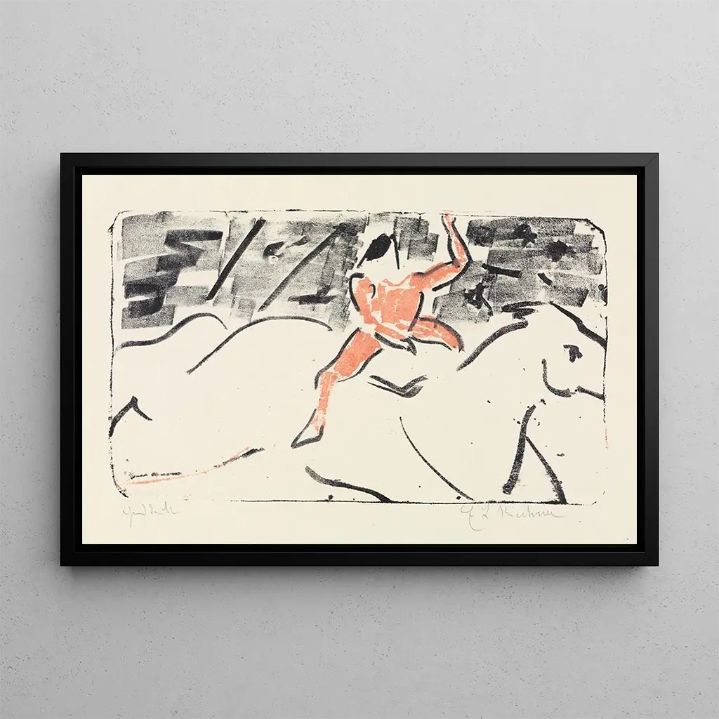 En esta obra vibrante, Ernst Ludwig Kirchner captura la energía de un cavalier de cirque sobre un majestuoso caballo blanco. Los colores vibrantes y los trazos expresivos evocan una atmósfera de movimiento y dinamismo. El fondo, a la vez abstracto y sugestivo, acentúa la presencia del caballero, mientras que las tonalidades de blanco y azul crean un contraste impactante. Kirchner, con su técnica audaz, logra transmitir una sensación de libertad y alegría, invitando al espectador a sumergirse en este universo festivo donde el hombre y el animal parecen en perfecta armonía.