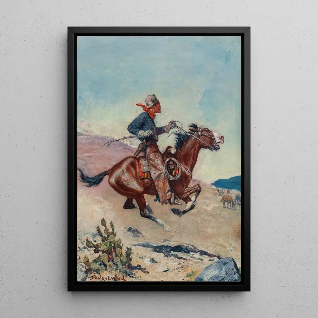 Stanley Llewellyn Wood, peintre britannique actif à la fin du XIXe siècle, est reconnu pour ses œuvres qui célèbrent l'Ouest américain et ses légendes. Influencé par les récits de l'époque, il a su capturer la grandeur des paysages et l'esprit indomptable des personnages qui les habitent. Ses œuvres, souvent inspirées par des événements historiques, témoignent d'une époque où le Pony Express symbolisait la rapidité et l'audace dans la communication. Wood a su s'imposer comme un artista importante de son temps, mêlant réalisme et romantisme pour donner vie à des scènes emblématiques de l'histoire américaine.
