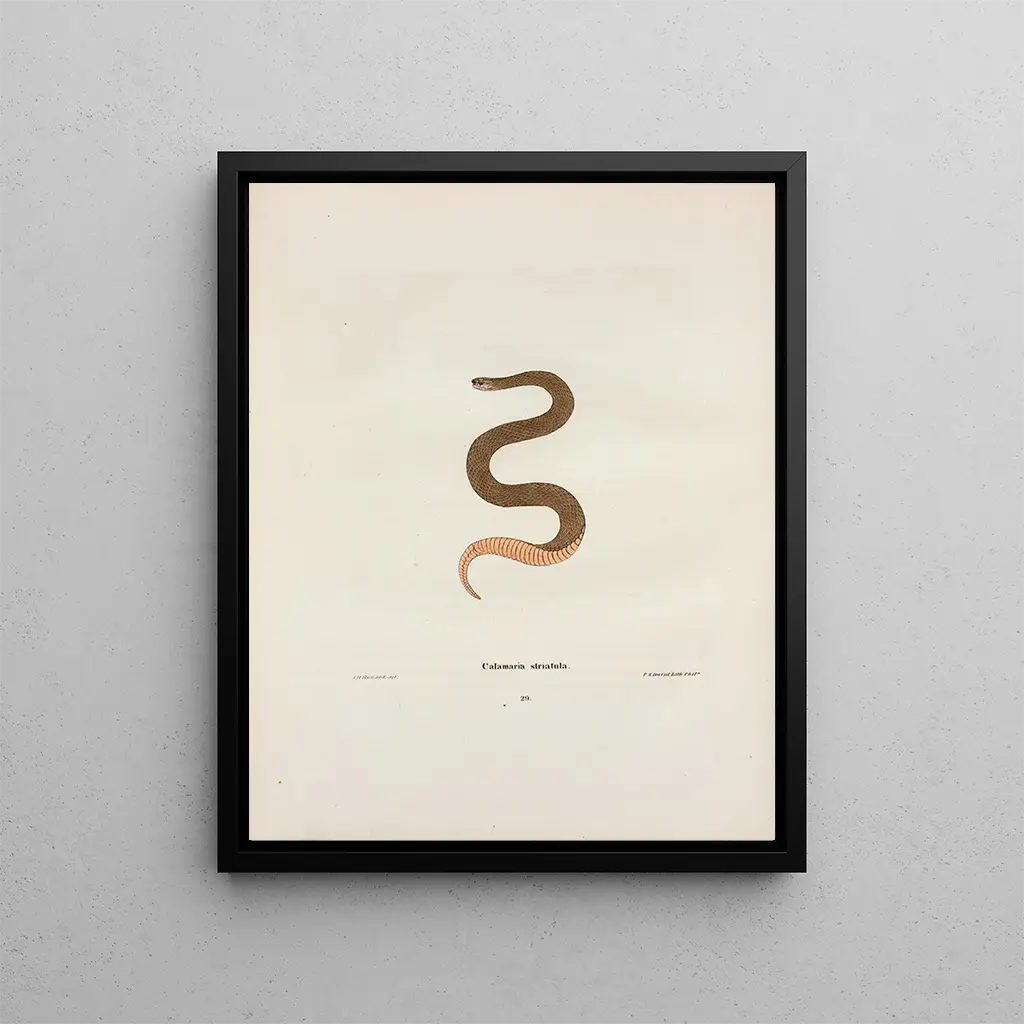 Reproducción artística de Calamaria elapsoidea, una especie de serpiente de la familia Colubridae. Esta impresión en lienzo captura con detalle la elegancia y la precisión de esta criatura única, perfecta para decorar su hogar u oficina con un toque de naturaleza exótica.