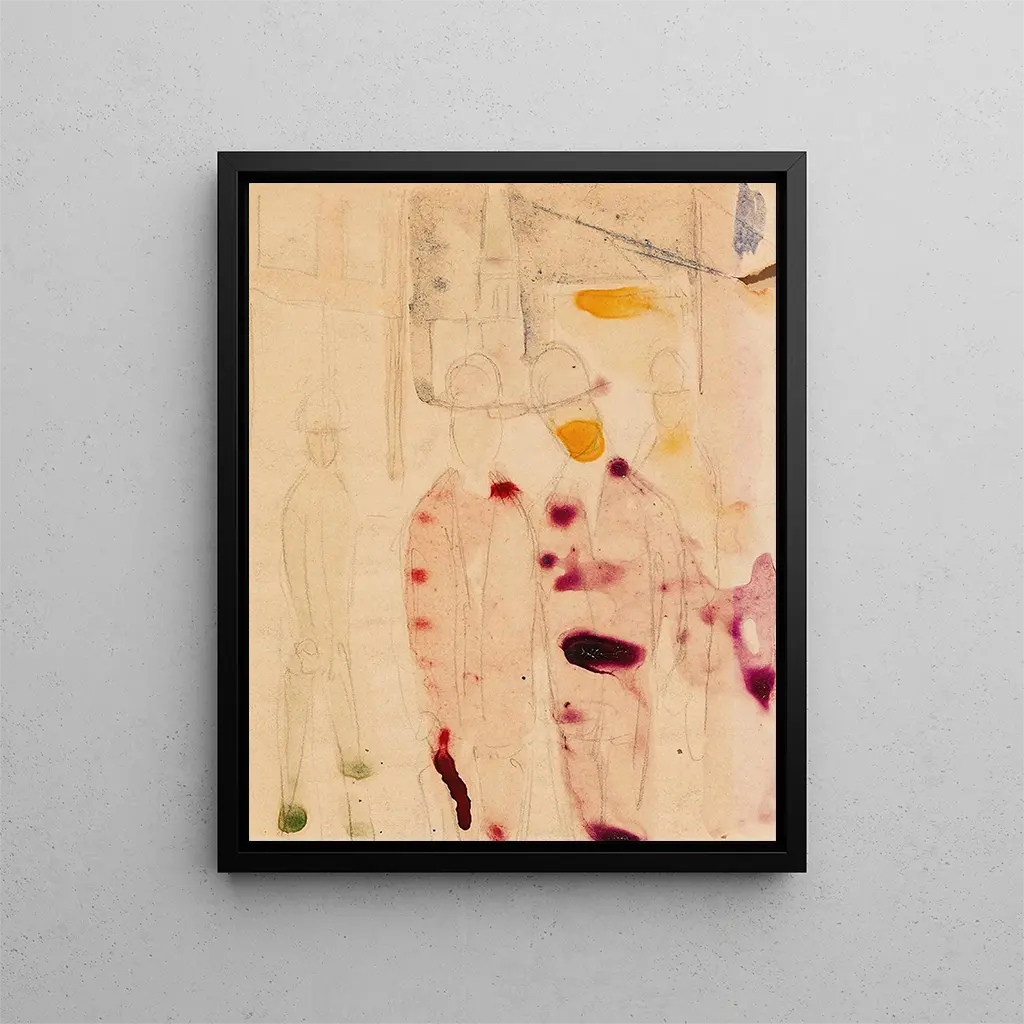 "Calle con gente pequeña" es un ejemplo emblemático del estilo único de August Macke, que se caracteriza por su uso audaz del color y de la luz. Los personajes, aunque representados en una escala reducida, están impregnados de una vitalidad palpable, como si bailaran en un ballet silencioso en el corazón de la ciudad. Los tonos brillantes de azul, amarillo y rojo se entrelazan de manera armoniosa, creando una atmósfera a la vez dinámica y tranquilizadora. Las líneas fluidas y las formas simplificadas reflejan la influencia de los movimientos artísticos contemporáneos, al mismo tiempo que revelan la sensibilidad personal del artista. La obra invita al espectador a sumergirse en un mundo donde lo cotidiano se vuelve poético, donde cada figura es una historia en sí misma.