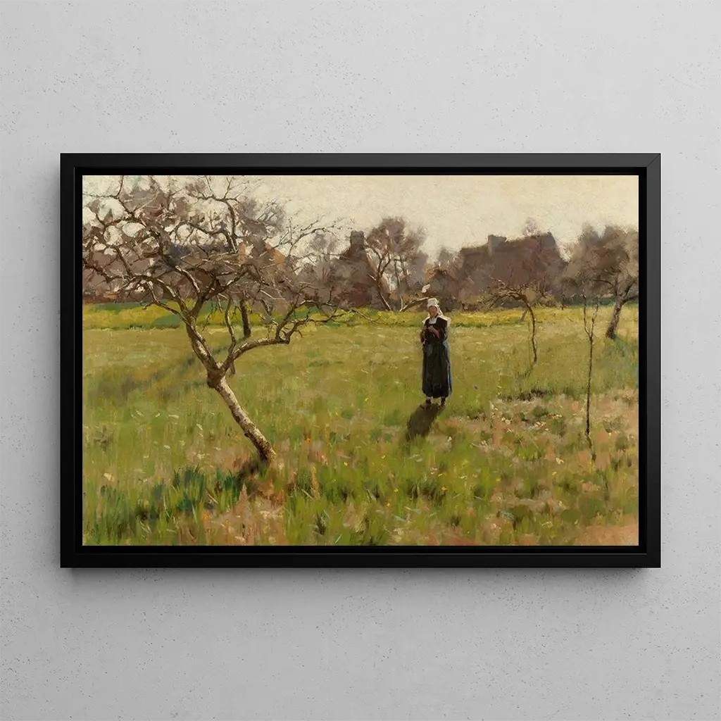 La impresión artística de Champ de Bretagne avec figure, realizada por Arthur Wesley Dow, evoca la belleza salvaje y tranquila de los paisajes bretones. Este lienzo se distingue por su paleta de colores vibrantes, donde los verdes y los amarillos se mezclan para representar la vegetación exuberante. La presencia de una figura humana, integrada armoniosamente en el paisaje, añade una dimensión narrativa a la obra. Dow, con su técnica impresionista, logra capturar la luz y la atmósfera bretona, ofreciendo así una invitación a la ensoñación y a la evasión en esta naturaleza preservada.