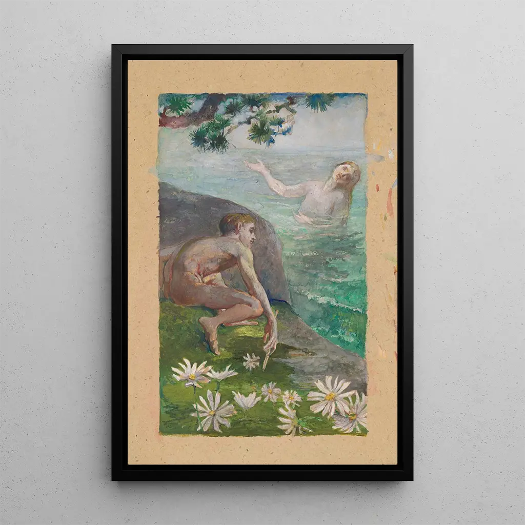 La impresión artística "Chant de la sirène" de John La Farge evoca una atmósfera envolvente donde el mar y la mitología se encuentran. Los colores vibrantes y las tonalidades delicadas de azul y verde crean un ambiente acuático, mientras que la sirena, figura central, parece cantar una melodía suave y melancólica. La técnica de La Farge, que combina pintura al óleo y influencias del vitral, confiere a la obra una luminosidad única. Cada pincelada parece vibrar, capturando la esencia de un momento suspendido entre sueño y realidad.