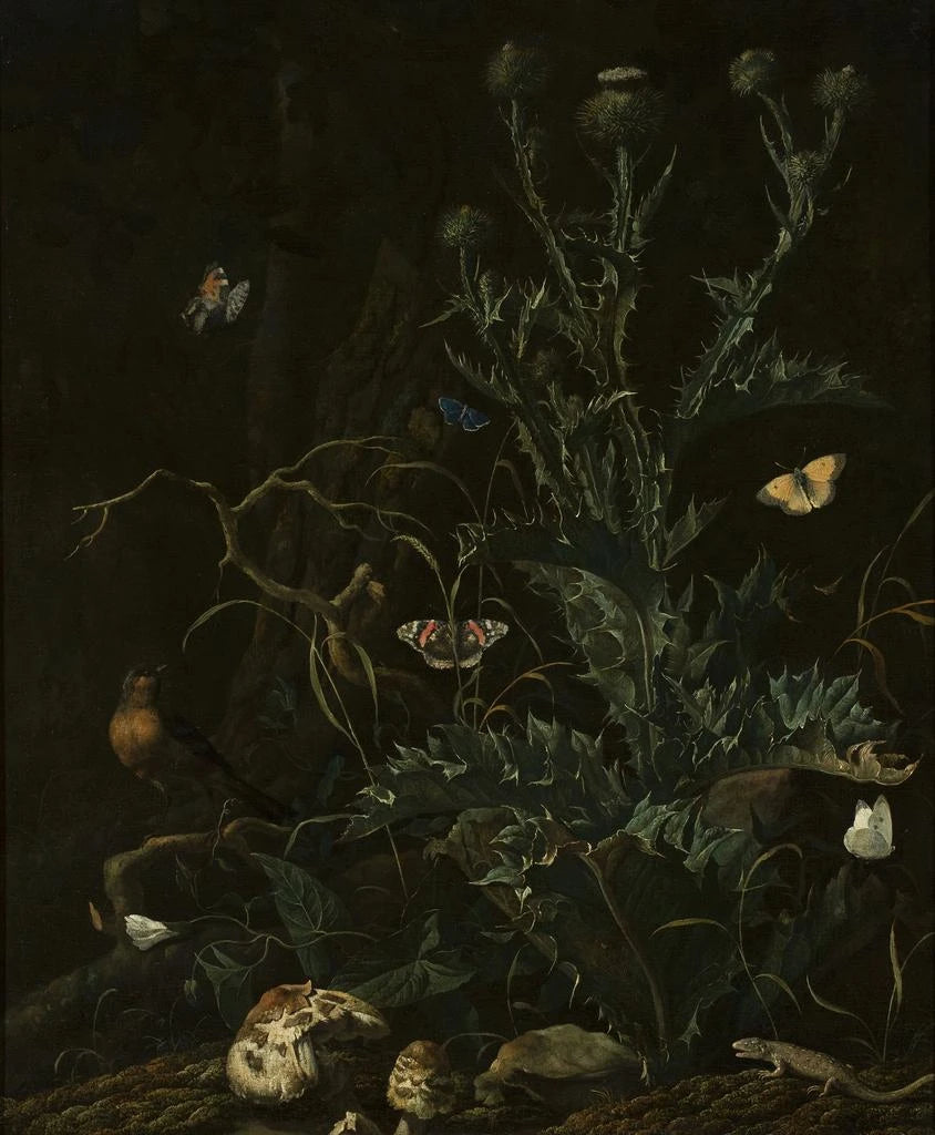 Este cuadro se distingue por su uso virtuoso de la luz y las sombras, características del estilo barroco. Begeyn sabe jugar con los contrastes para dar vida a sus temas, haciendo que cada cardo sea casi tangible, cada mariposa delicada y cada lagarto vibrante. Los colores, a la vez vivos y sutilmente matizados, crean una atmósfera a la vez serena y dinámica. La elección de los cardos, a menudo percibidos como plantas comunes, es un testimonio del ojo atento del artista para la belleza en lo cotidiano. Al integrar estos elementos en su composición, Begeyn eleva la naturaleza a un nivel artístico que interpela y fascina. La disposición de los temas, con un equilibrio perfecto, demuestra una maestría técnica inigualable, donde cada detalle está cuidadosamente pensado para contribuir a la armonía global de la obra.