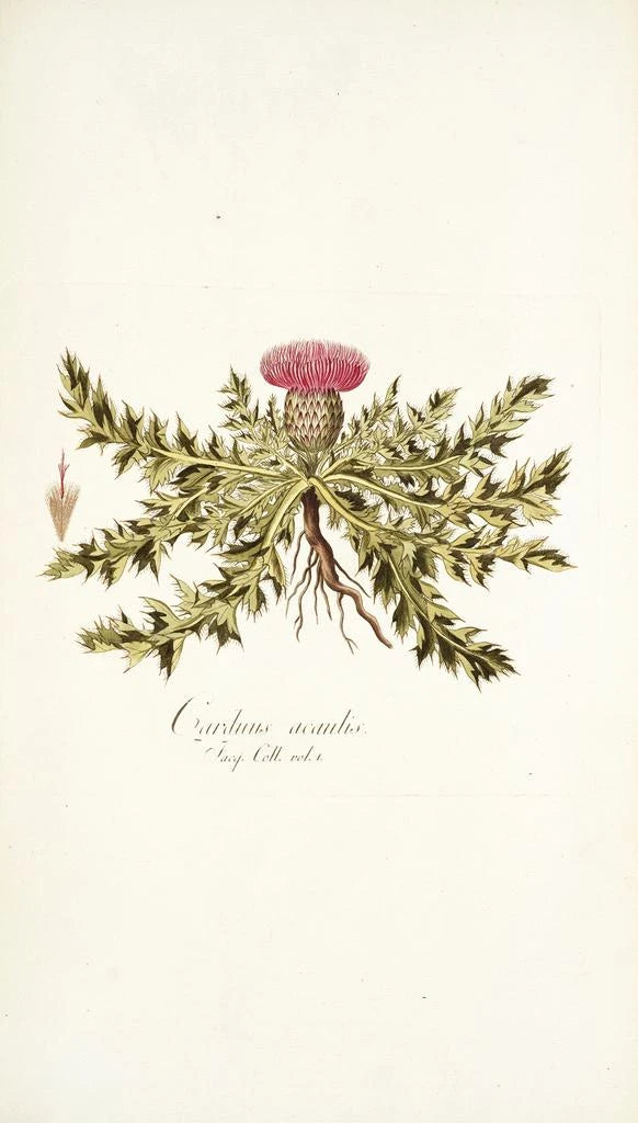 Nikolaus Joseph Freiherr von Jacquin, figura emblemática del siglo XVIII, supo fusionar el arte y la ciencia a través de sus ilustraciones botánicas. Criado en un entorno académico, fue influenciado por los avances científicos de su época y viajó para estudiar la biodiversidad. Su trabajo sobre Carduus acaulis demuestra su compromiso de representar fielmente las plantas, al mismo tiempo que las hace accesibles a un público más amplio. Sus obras no solo son ilustraciones, sino también testimonios de la riqueza de la naturaleza, contribuyendo al auge de la botánica moderna.