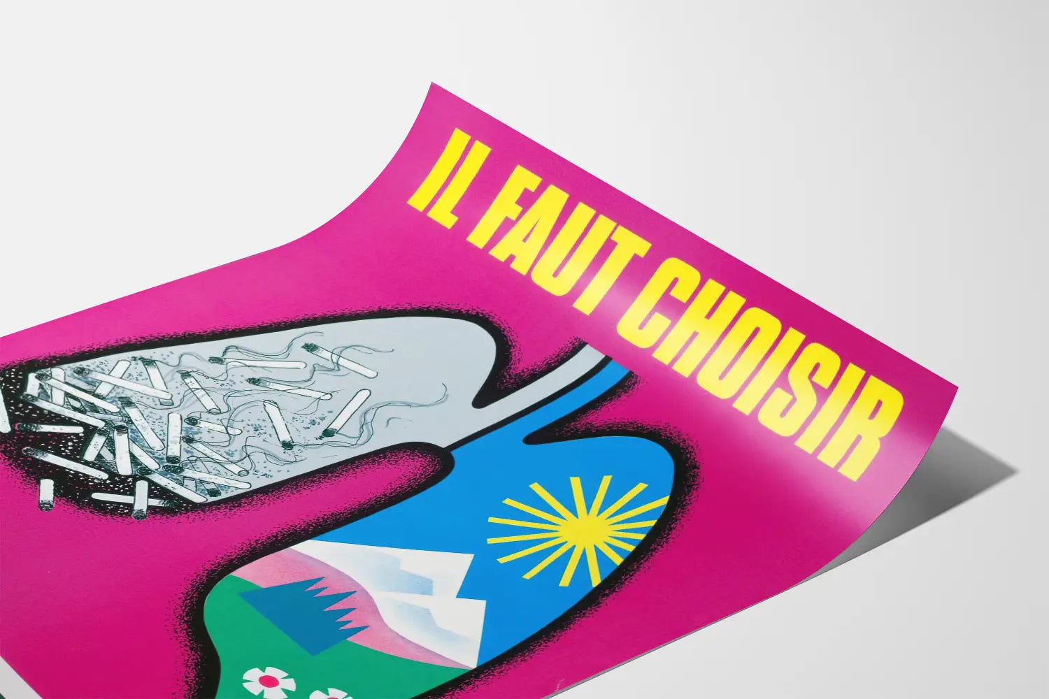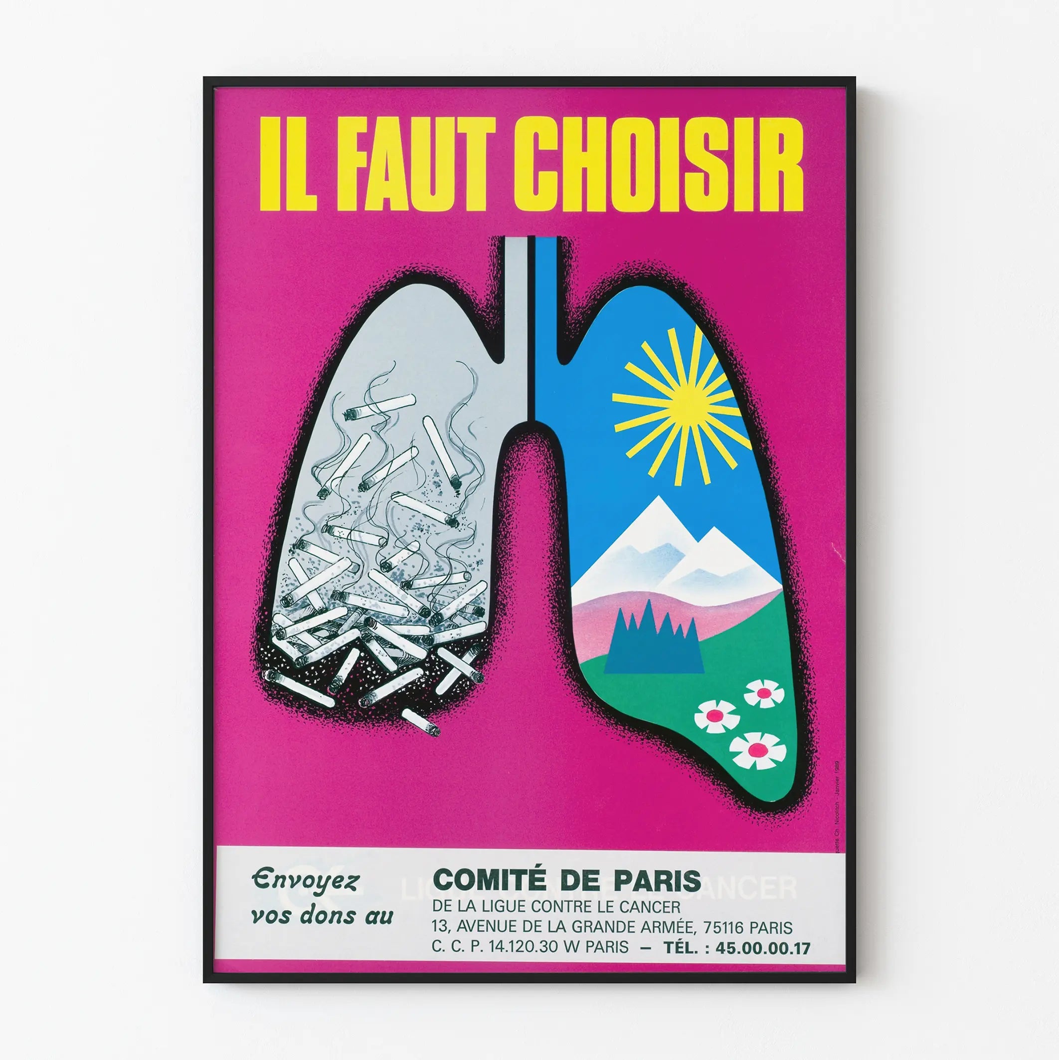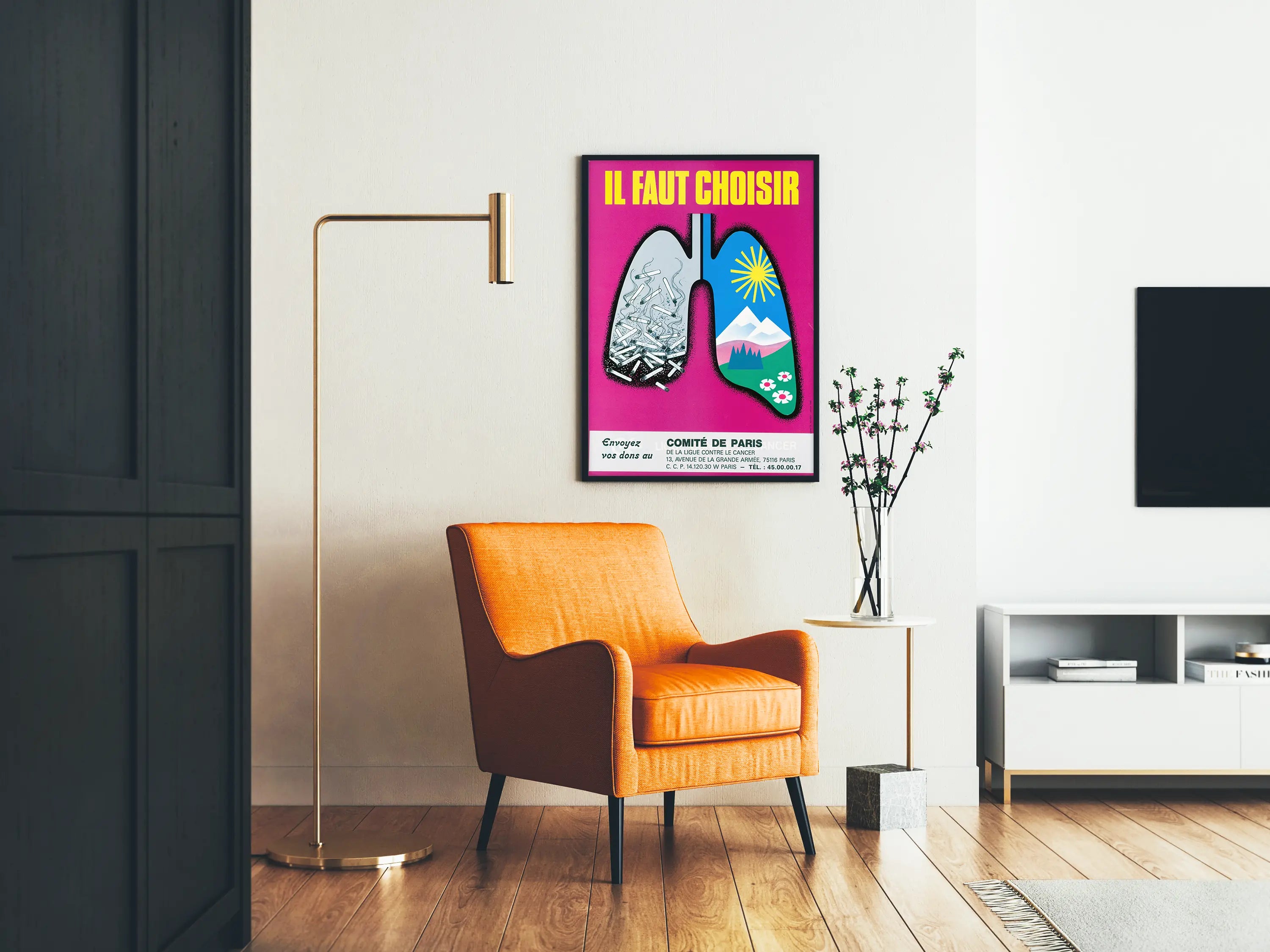 Este cartel vintage contra el tabaquismo es una pieza destacada de decoración mural comprometida. Ilustra de manera impactante la elección entre dos pulmones: uno lleno de cigarrillos humeantes, símbolo de la degradación causada por el tabaco, y el otro, colorido y luminoso, muestra un paisaje natural con flores, montañas y sol, que representan la salud y la vitalidad. El fuerte contraste visual se acentúa con un fondo rosa brillante y el texto «ES NECESARIO ELEGIR» en amarillo, que capta inmediatamente la atención y transmite un mensaje claro y contundente contra el tabaquismo. En la parte inferior del cartel, los datos de contacto del Comité de París de la Liga contra el Cáncer invitan a realizar donaciones, reforzando así el carácter activista y colectivo de esta pieza. Este cartel encaja perfectamente en una decoración mural dedicada a mensajes de salud pública o a un estilo retro comprometido. Encontrará su lugar en una pared de oficina, un espacio de sensibilización o como una pieza original en un interior contemporáneo. Regálate o regala a un ser querido este cartel vintage para un efecto decorativo fuerte, combinando arte gráfico y un mensaje social importante. Una elección decorativa que invita a la reflexión sobre el tabaquismo y sus consecuencias para la salud.