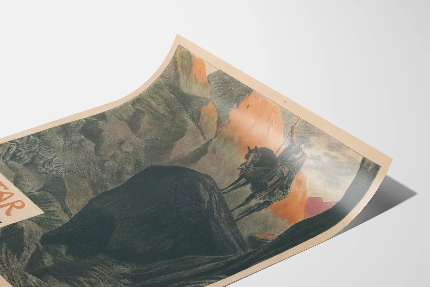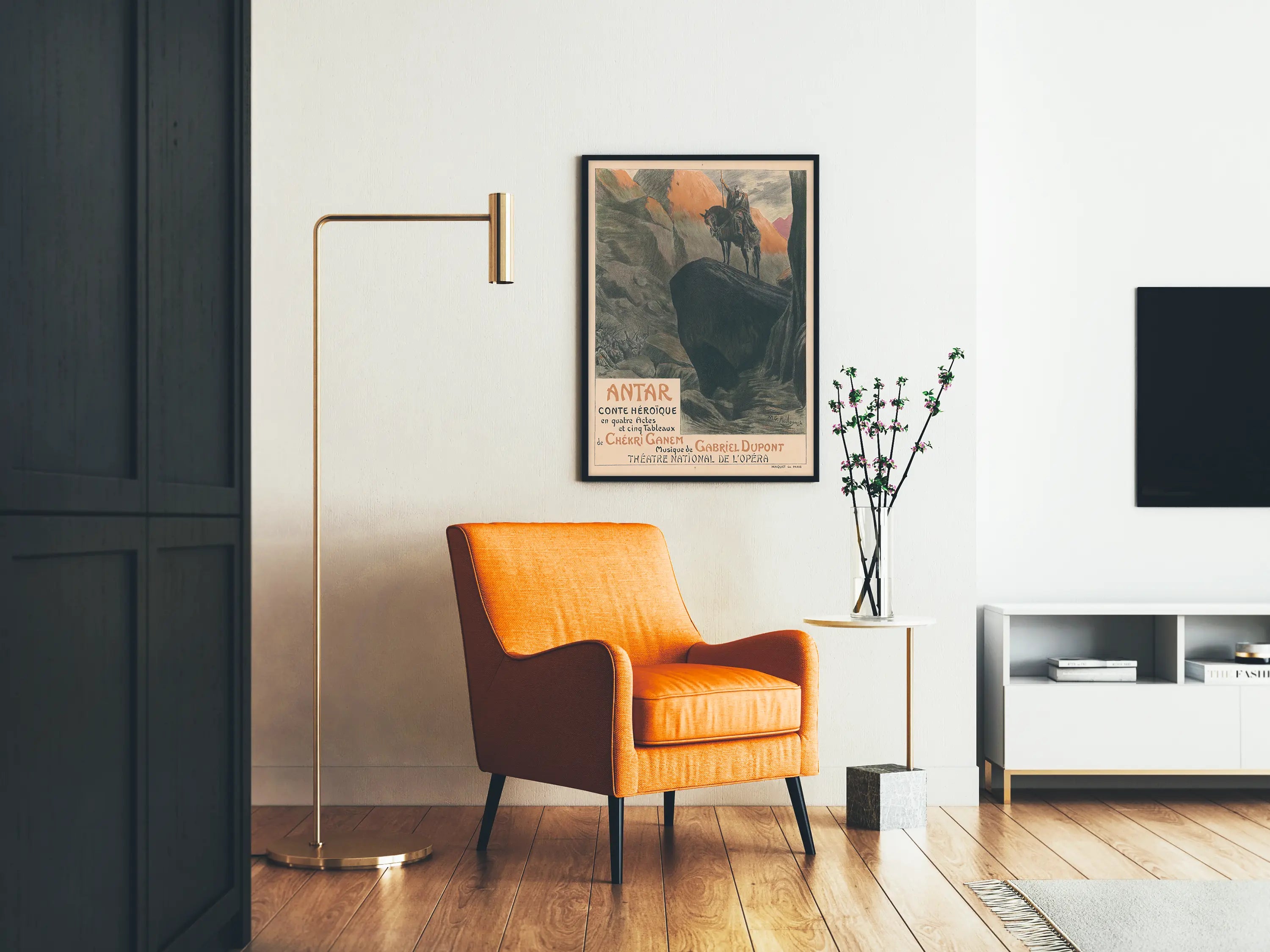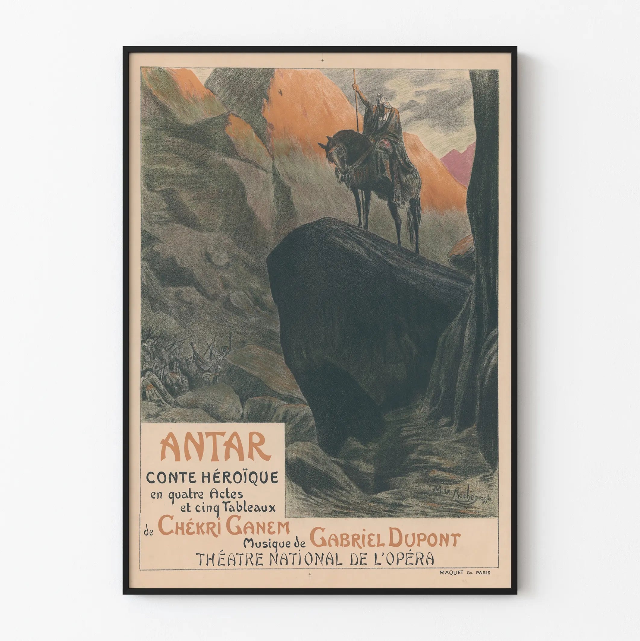 Este cartel antiguo ilustra "Antar, relato heroico en cuatro actos y cinco cuadros", una obra dramática con música compuesta por Gabriel Dupont. Proviene del Teatro Nacional de la Ópera y fue diseñada por M.G. Rochegrosse. Este cartel destaca a un personaje heroico montado a caballo, dominando un paisaje montañoso en tonos ocres y oscuros. El contraste entre la silueta del jinete y la naturaleza circundante crea una atmósfera dramática y misteriosa. Este tipo de cartel es ideal para una decoración mural clásica y cultural, aportando un toque teatral y artístico a cualquier interior. Colocado en una sala de estar, una biblioteca o un espacio dedicado a las artes, realza el encanto de las obras teatrales históricas y las composiciones musicales de época. Este cuadro mural contribuye a crear un ambiente lleno de historia y emociones, perfecto para los amantes del teatro, la música clásica y las ilustraciones vintage. El uso de colores sobrios y la composición cuidada lo convierten en una pieza decorativa elegante, que se integra armoniosamente en diferentes estilos decorativos, ya sean tradicionales o más eclécticos. Elegir este cartel como decoración mural permite combinar cultura y estética en una presentación refinada y evocadora.