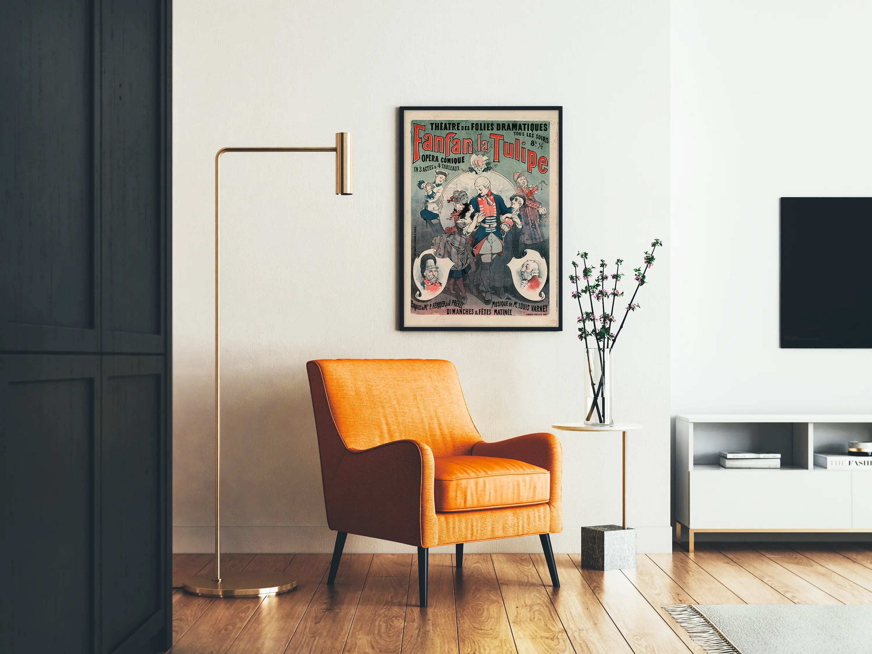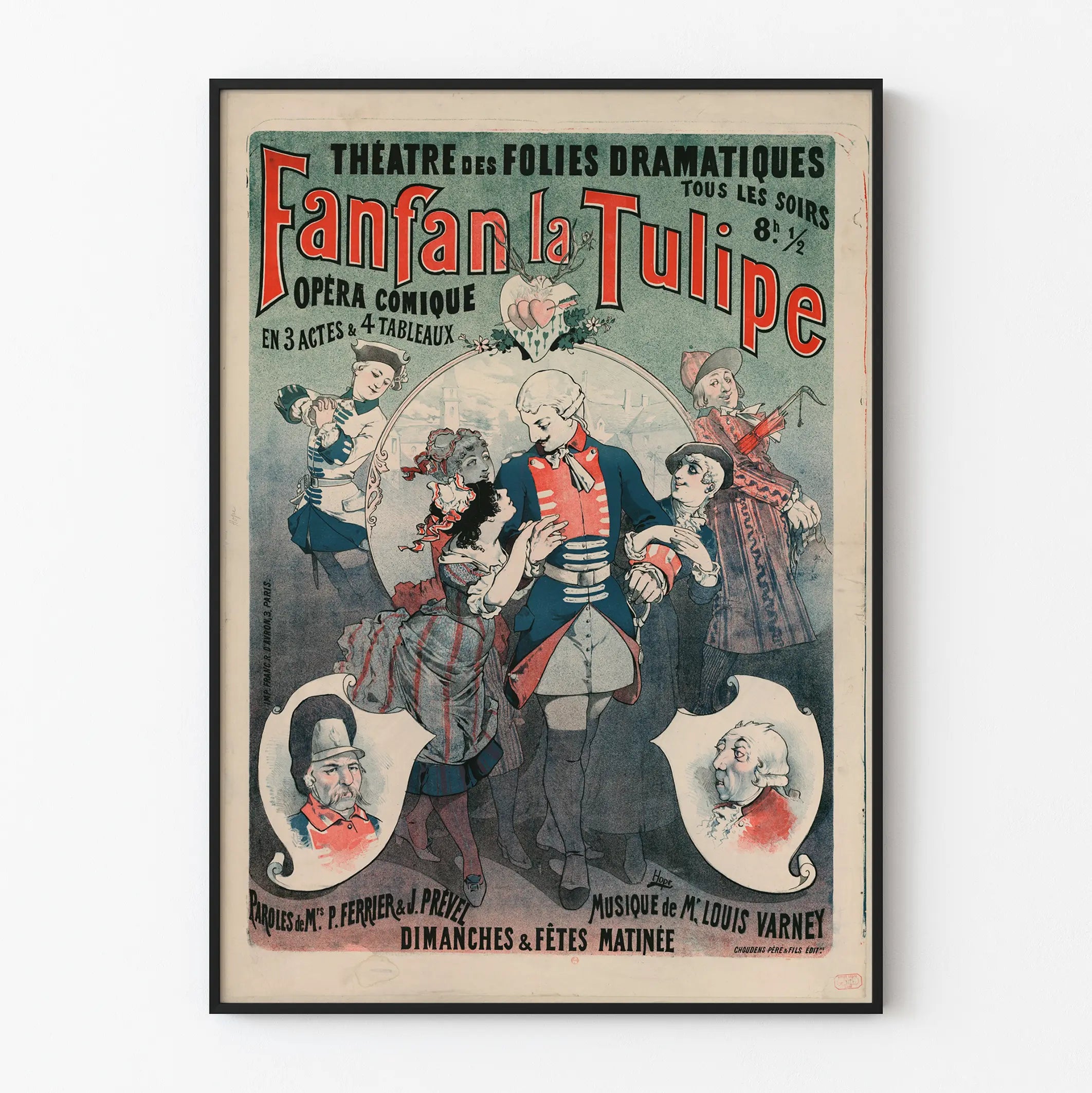 Descubra esta cartel vintage que ilustra la representación de "Fanfan la Tulipe", una ópera cómica en 3 actos y 4 cuadros presentada en el Teatro de las Follies Dramatiques. Este cartel de decoración mural es un ejemplo perfecto de arte gráfico teatral, combinando tipografía imponente e ilustración detallada de personajes disfrazados sobre un fondo de tonalidades azul, rojo y crema. La obra destaca varios personajes con vestimenta de época, alrededor del héroe central en uniforme azul y rojo, todos dibujados con una expresividad encantadora que captura el ambiente festivo y teatral de la ópera. Este cartel antiguo, realizado en litografía, también promociona las letras de los señores P. Ferrier y J. Prével, así como la música del señor Louis Varney, añadiendo una dimensión cultural a esta obra mural. Ideal para los amantes de la decoración mural con temática vintage o quienes buscan embellecer un espacio con una impresión artística tradicional, esta reproducción puede servir como pieza central para una sala, una oficina o un teatro. Ofrezca a su interior un toque de nostalgia y cultura con este cartel de ópera, perfecto para los apasionados del teatro y la historia del arte. Una opción decorativa elegante que evoca el encanto del siglo XIX a través de colores sutilmente pasados y un diseño cuidado.