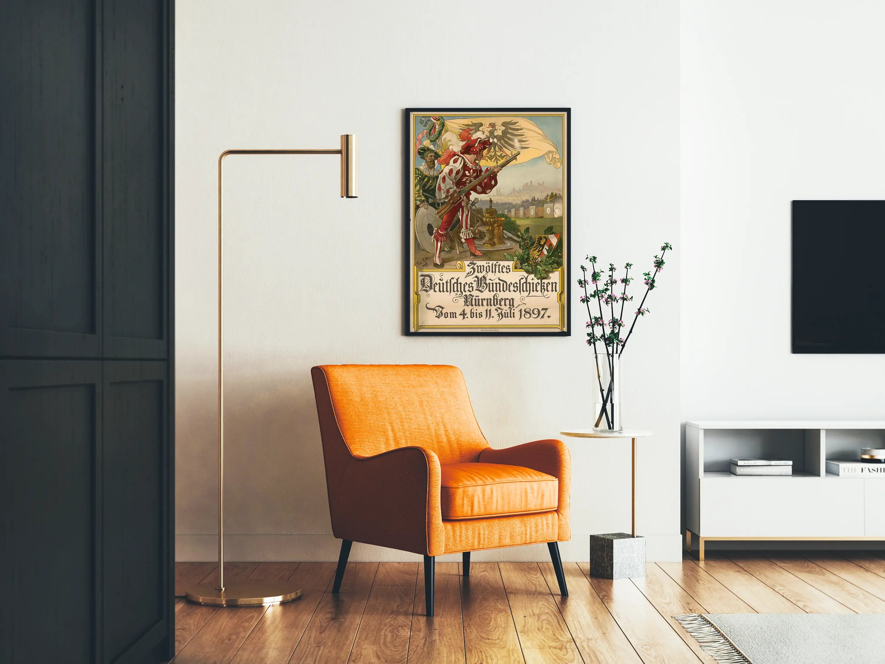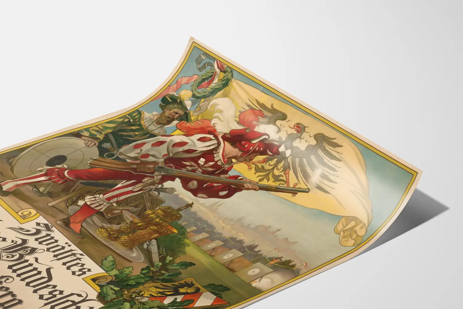 Este cartel antiguo representa el Zwölftes Deutsches Bundesschießen, un evento de tiro organizado en Nuremberg del 4 al 11 de julio de 1897. Muestra una escena llena de detalles históricos, con dos hombres vestidos con trajes tradicionales y uno de los arqueros preparándose para disparar con un fusil, símbolo de la competencia de tiro. En el fondo, se distingue un objetivo y un paisaje arquitectónico emblemático de la ciudad, cuyas siluetas de edificios se dibujan bajo un cielo despejado. La bandera amarilla adornada con un águila negra es un elemento central que confiere a este cartel un carácter oficial y simbólico. En la parte inferior, un recuadro destaca en letras góticas el título del evento, asegurando una gran legibilidad y aportando un toque auténtico al estilo gráfico de finales del siglo XIX. Esta decoración mural es ideal para los amantes de la historia alemana, del tiro o del diseño gráfico de época. En versión póster o cartel, aporta una atmósfera vintage y cultural a cualquier interior, ya sea en una sala de estar, una oficina o una sala de recreo. Este cartel histórico se distingue por sus colores cálidos, sus detalles finamente elaborados y su estilo tipográfico característico, un equilibrio perfecto entre arte decorativo y comunicación de eventos. Esta pieza única de decoración mural te invita a sumergirte en el ambiente festivo y competitivo de Alemania a finales del siglo XIX.