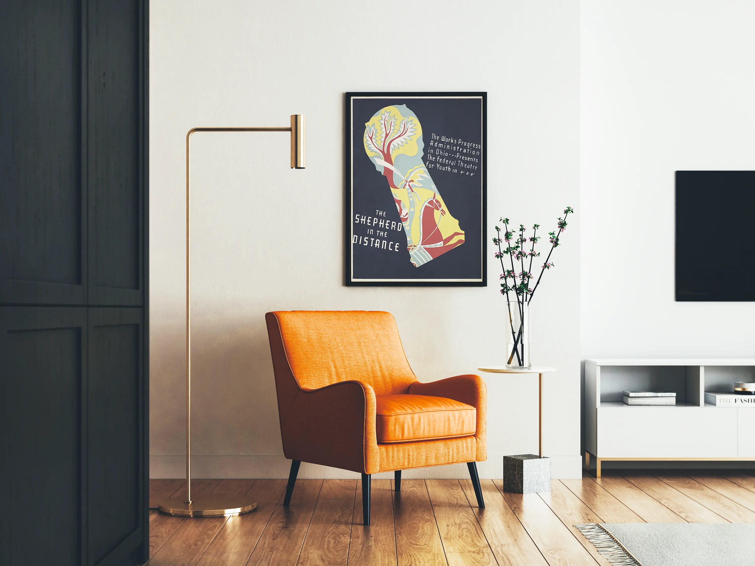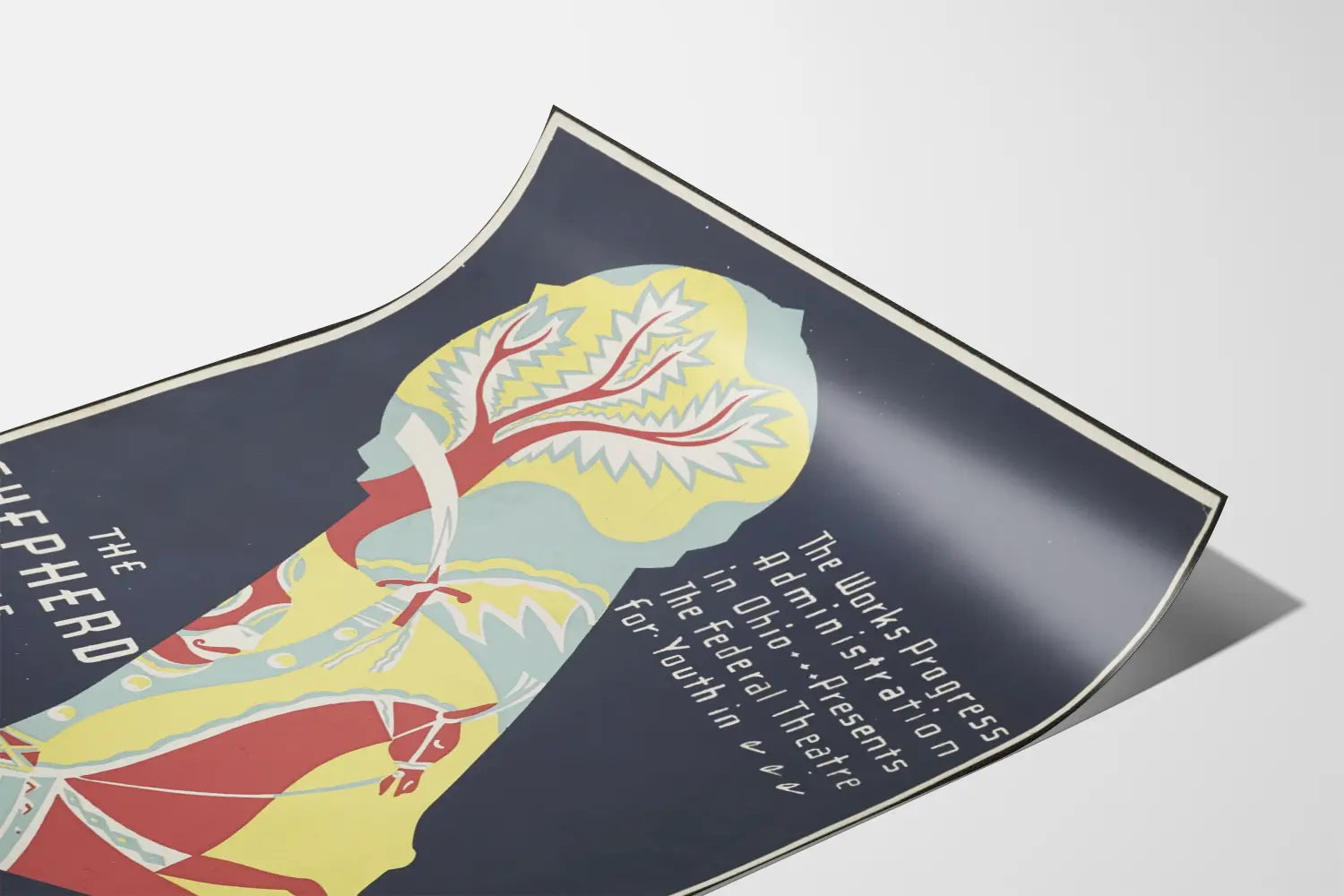 Esta cartelera representa una decoración mural única con un estilo art déco marcado por formas geométricas y colores contrastantes. Se distingue una silueta que incluye un árbol estilizado y un caballo decorado, todo bañado en tonos de rojo, amarillo, azul claro y blanco sobre un fondo oscuro. El texto inscrito en caracteres blancos evoca una presentación teatral organizada por la administración de trabajos progresivos en Ohio, dirigida a la juventud. Esta composición gráfica original invita a una atmósfera vintage y artística, perfecta para enriquecer una decoración mural en un interior contemporáneo o retro. En formato póster, esta cartelera aportará un toque cultural e inspirador a una sala, una oficina o un espacio dedicado a las artes. Su diseño dinámico y su paleta de colores la convierten en un elemento decorativo atractivo que capta la atención y despierta la curiosidad. Ideal para los amantes del arte gráfico, del teatro o de la historia visual, esta decoración mural transforma una pared clásica en una verdadera obra de arte, combinando una atmósfera histórica con una estética moderna. Se combina fácilmente con muebles de madera clara, accesorios minimalistas y elementos decorativos industriales, ofreciendo así una versatilidad en la disposición para diversos estilos de espacios.