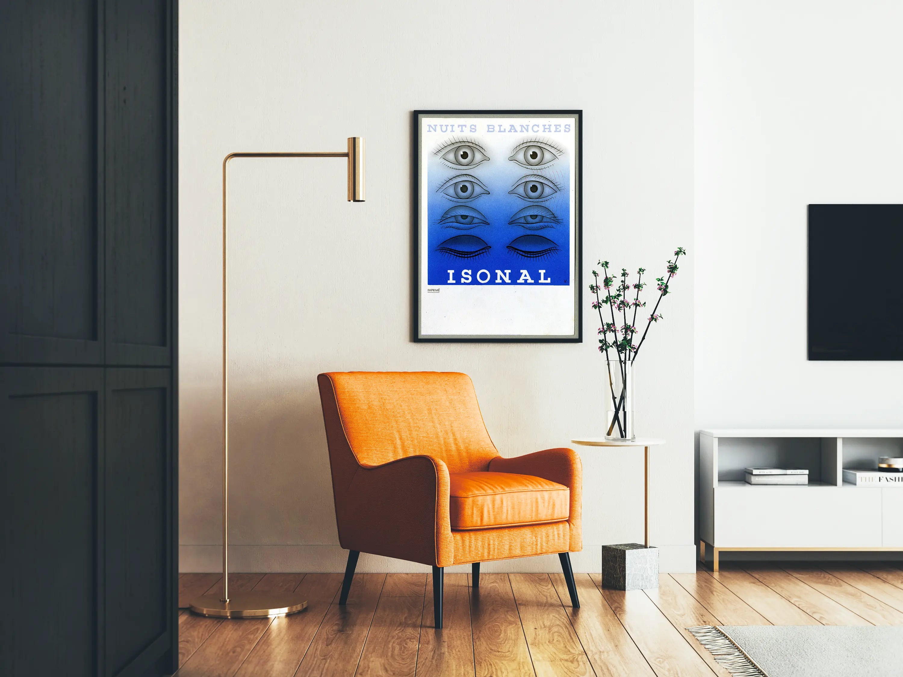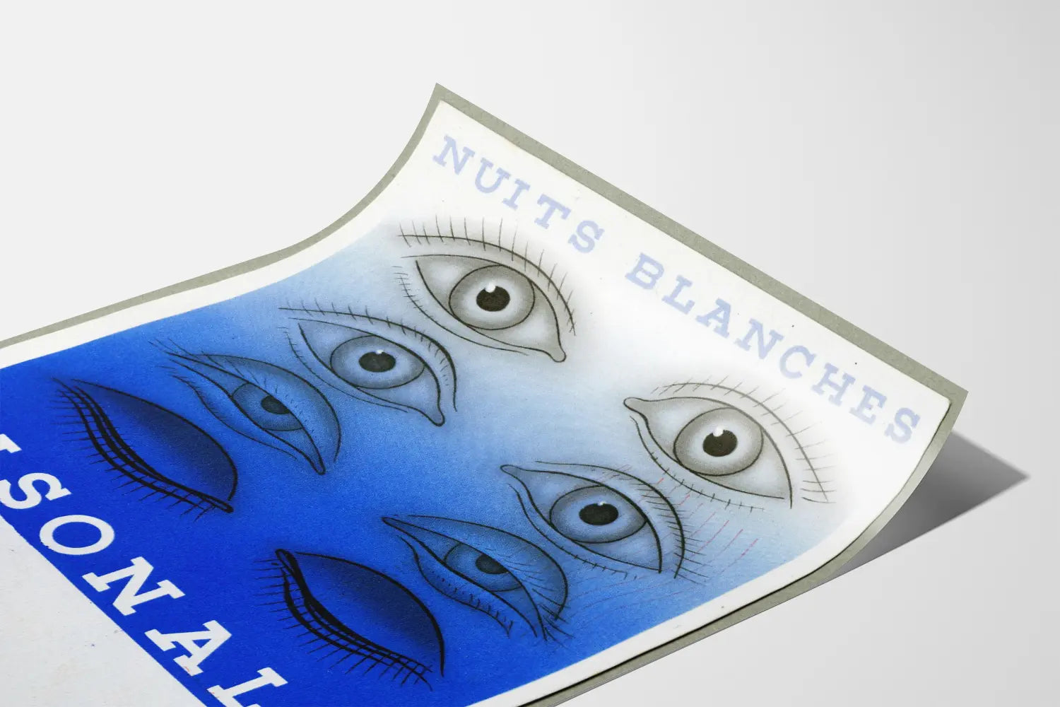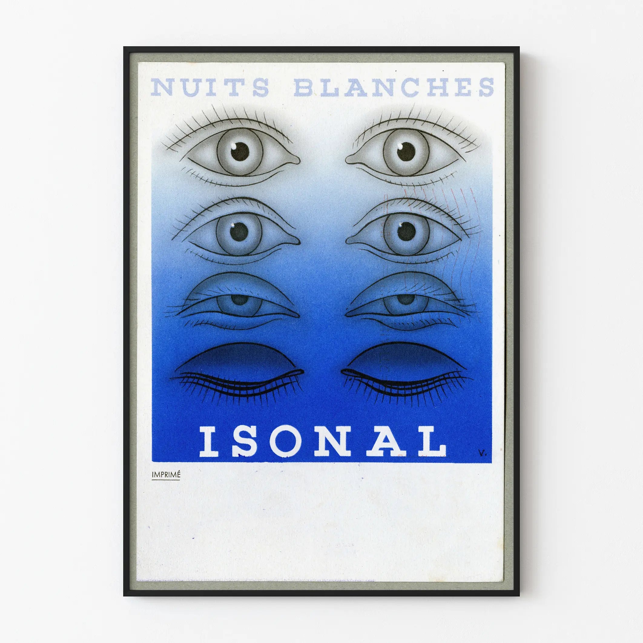 El texto « NOCHES EN BLANCO » aparece en la parte superior de la impresión en letras mayúsculas azul pálido, mientras que la palabra « ISONAL » está centrada en la parte inferior en blanco, sobre un fondo azul más intenso. Estos elementos tipográficos aportan un estilo gráfico coherente y equilibrado con el motivo principal. La pequeña palabra « IMPRESO » en la esquina inferior izquierda indica la naturaleza de esta creación, una verdadera impresión artística y no una reproducción digital.